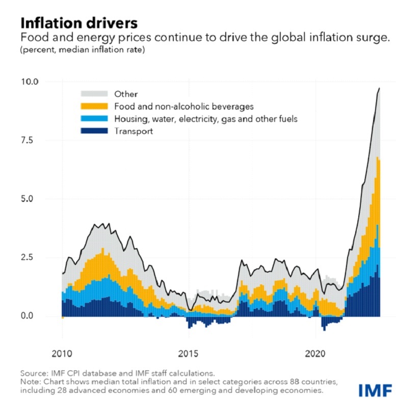 Σε ένα σοβαρό σημείωμα του ΔΝΤ πριν λίγες μέρες, για τα τρόφιμα και την ενέργεια που οδηγούν την παγκόσμια αύξηση του πληθωρισμού φαίνεται ότι είναι οι κύριοι παράγοντες αυτού του πληθωρισμού, όπως δείχνει το διάγραμμα που ακολουθεί. Έτσι, ένας οργανισμός όπως το ΔΝΤ διαπιστώνει ότι ο πληθωρισμός των τροφίμων από μόνος του έχει διαβρώσει το παγκόσμιο βιοτικό επίπεδο σε μικρό χρονικό διάστημα, με τον ίδιο ρυθμό που είχε ο πληθωρισμός όλων των καταναλώσεων τα πέντε χρόνια αμέσως πριν από την πανδημία.