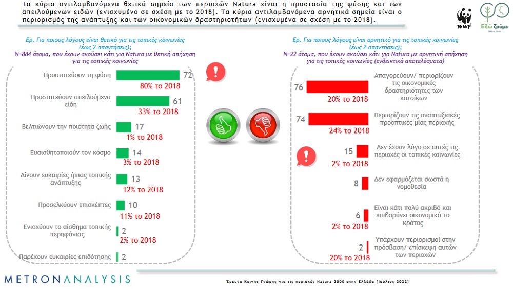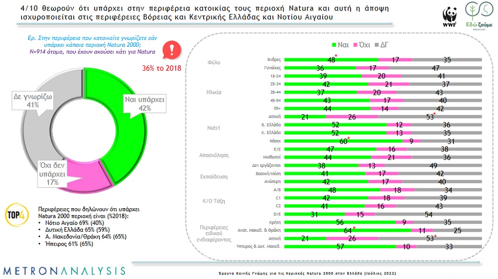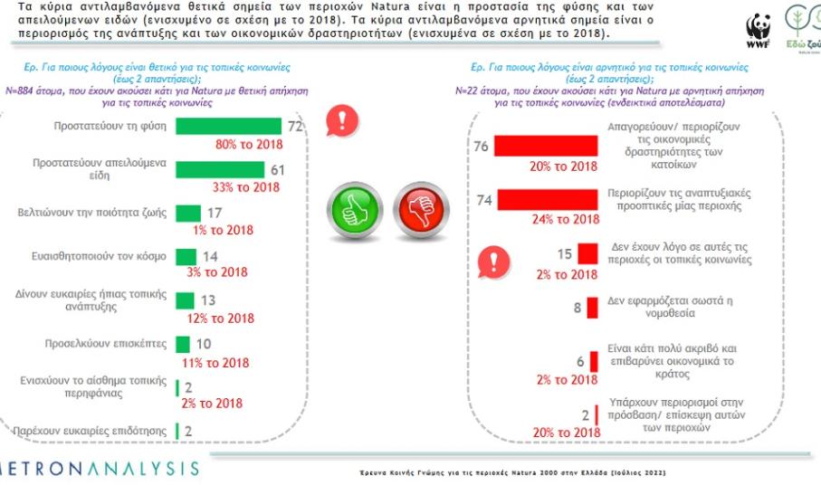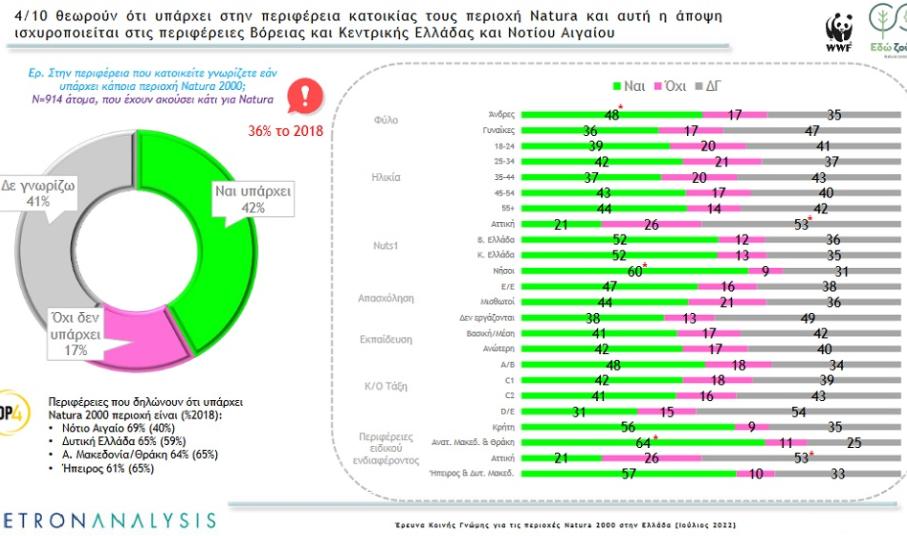Ενδιαφέρον προκαλεί το γεγονός ότι το ποσοστό των ερωτώμενων που έχουν ακούσει για τις περιοχές Natura αυξήθηκε σε σχέση με το 2018 (πλέον 8 στους 10 Έλληνες), αλλά μόνο οι μισοί από αυτούς δηλώνουν καλά ενημερωμένοι. Επιπλέον, 5 στους 10 Έλληνες θεωρούν ότι οι περιοχές αυτές προστατεύουν τόσο γεωγραφικές ενότητες, όσο και είδη της πανίδας και της χλωρίδας. Ανησυχητικό, ωστόσο παραμένει ότι το ποσοστό των Ελλήνων που δηλώνουν πως γνωρίζουν για τις περιοχές Natura είναι ακόμα πολύ χαμηλό στους νέους ηλικίας από 18 έως 24 ετών (μόνο 4 στους 10).