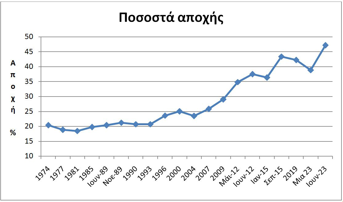 Το πρώτο που παρατηρείται είναι ότι, ενώ στη διάρκεια του περασμένου αιώνα, η αποχή ήταν σχεδόν σταθερή σε διαδοχικές εκλογές, γύρω στο 20%, από τον 21ο αιώνα άρχισε να ανέρχεται σταθερά, για να κορυφωθεί στις τελευταίες εκλογές στο 47,17%. Υπάρχουν λόγοι για να παρατηρείται αποχή, όπως η μη ενημέρωση των εκλογικών καταλόγων, η απουσία πολλών σε άλλες χώρες κλπ. Ωστόσο, όλες αυτές οι συνθήκες δεν άλλαξαν ουσιαστικά από τη μεταπολίτευση και μετά, που μας απασχολεί, ιδιαίτερα δεν άλλαξαν τον τελευταίο μήνα, που η αποχή ανέβηκε σημαντικά. Κάτι πρέπει να συμβαίνει.