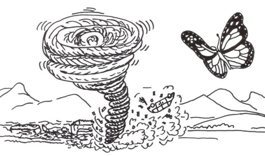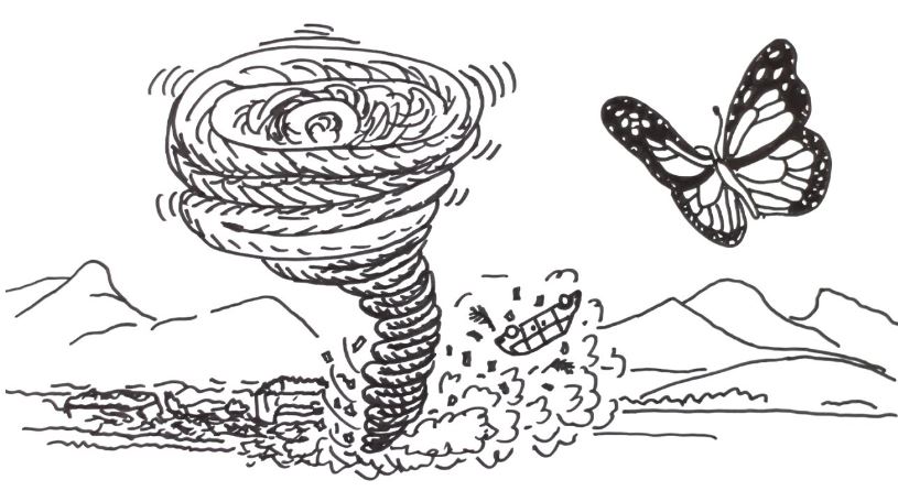 Οι αριθμοί που παραθέτω παρακάτω είναι στρoγγυλεμένοι με μεγάλο προσεγγιστικό σφάλμα. Λοιπόν τα Ιωάννινα απέχουν από τον Πειραιά 500 χιλιόμετρα. Χρειάζομαι 4 ώρες για να μεταβώ από τη μια πόλη στην άλλη. Τα Ιωάννινα απέχουν 750 χιλιόμετρα από το Ηράκλειο της Κρήτης. Λογικά θα πρέπει να χρειάζομαι 6 ώρες για να πάω εκεί. Κι όμως, από την αφετηρία μου ως τον ενδιάμεσο σταθμό, τον Πειραιά, πήγα με αυτοκίνητο που έτρεχε 120 χιλιόμετρα την ώρα, ενώ από τον Πειραιά ως το Ηράκλειο ταξίδεψα με πλοίο που έτρεχε 20 χιλιόμετρα την ώρα. Το χειρότερο είναι ότι, επειδή πλοίο από Πειραιά για Ηράκλειο φεύγει κάθε 24 ώρες, αν δεν το προλάβω θα καθυστερήσω μια ολόκληρη ημέρα και η διαδρομή μου σημαίνει ταξίδι αντί των 6 ωρών, σχεδόν μιάμιση ημέρας ή και, εντελώς απρόβλεπτο χρόνο, αν τύχει κακοκαιρία που απαγορεύει τον απόπλου. Κι αυτό διότι υπάρχει ασυνέχεια στη διαδρομή. Πώς λοιπόν να προσδιορίσω το μέλλον από ό,τι συνέβηκε στο παρελθόν και συμβαίνει στο παρόν; Για τη λύση αυτού του προβλήματος επινοήθηκε η μαθηματική θεωρία του χάους. Όταν δηλαδή το πρόβλημα αφορά όχι συνέχεια, αλλά ασυνέχεια, είναι μη γραμμικό. Μικροσφάλματα στις αρχικές συνθήκες μπορεί να συνεπάγονται πολύ διαφορετικά αποτελέσματα, καθιστώντας τη μακροπρόθεσμη πρόβλεψη αδύνατη. Αυτό είναι το ντετερμιστικό χάος (ή απλά χάος), που ο Λόρεντζ (Edward Lorenz) περιέγραψε ως εξής: Όταν το παρόν καθορίζει το μέλλον, αλλά η προσέγγιση του παρόντος δεν προσδιορίζει κατά προσέγγιση το μέλλον. Λόγω της ασυνέχειας, ένα μικρό ερέθισμα μπορεί να προκαλέσει ένα μεγάλο αποτέλεσμα που μάλιστα επιμένει μετά τη λήξη του ερεθίσματος. Μια μικρή χιονόμπαλα που ξεκόλλησε στη κορυφή και κατρακυλά μπορεί να κινητοποιήσει μια τεράστια μπάλα χιονιού, που κατεβαίνοντας κινητοποιεί ένα βουνό από πάγο: Χιονοστιβάδα. Με τον ίδιο μηχανισμό μια ελάχιστη κίνηση του αέρα από το πέταγμα μιας πεταλούδας στο Πεκίνο μπορεί να προκαλέσει έναν ανεμοστρόβιλο στην Ατλάντα των ΗΠΑ.