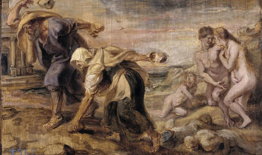 Παρόμοια έγιναν και στους Ελληνικούς μύθους. Ο Δευκαλίωνας, εγγονός του Ιαπετού, που είχε το ίδιο όνομα με το βιβλικό Ιάφεθ, επέζησε με πλοίο από τον Ελληνικό κατακλυσμό. Όταν αποσύρθηκαν τα νερά, αυτός και η γυναίκα του, η Πύρρα, κατέβηκαν την πλαγιά του Παρνασσού και πετούσαν πέτρες πίσω τους. Από τις πέτρες του Δευκαλίωνα φύτρωναν άντρες και από της Πύρρας γυναίκες. Έτσι βλάστησε ο ανώνυμος κόσμος στην Ελλάδα. Οι πέτρες ονομάζονταν λάας. Από το λάας προέρχονται λέξεις όπως λατομείο (=λιθοτομείο), λαξεύω (=λιθοξέω), λαλάρια (=βότσαλα). Υποστηρίχθηκε πως και το όνομα λαός έχει την ίδια προέλευση, αλλά δεν φαίνεται πιθανό. Στην Μυθολογία κανένας ανώνυμος δεν είχε την ευφυΐα του Δευκαλίωνα να επιβιώσει όπως αυτός κι έτσι τον ακολούθησαν έχοντάς τον βασιλιά κι αυτοί υπήκοοί για να επιβιώσουν. Εκτός όμως από αυτούς τους ανώνυμους, το ζευγάρι γέννησε και παιδιά, τον Δώρο, τον Αίολο και τον Ξούθο (ξανθό) από τον οποίον γεννήθηκαν ο Αχαιός και ο Ίωνας. Αυτοί ήταν οι πρόγονοι των Ελλήνων. Υπήρχαν όμως και άλλοι επώνυμοι. Από την κόρη του Δευκαλίωνα, την Πανδώρα, γεννήθηκε ο Γραικός με πατέρα το Δία. Δηλαδή ο πατέρας ήταν άγνωστος! Ο Γραικός εγκαταστάθηκε κάπου δυτικά. Οι δυτικοί λαοί αυτόν γνώρισαν από την ευρεία οικογένεια των Ελλήνων και έδωσαν το όνομα του Γραικού σε όλους τους Έλληνες. Ο Ίωνας πήγε στην Ανατολή κι έτσι οι Ανατολικοί λαοί ονόμασαν Ίωνες (Γιουνάν) όλους τους Έλληνες. Στη συνέχεια έγινε βασιλιάς των Αθηνών. Από τη Θυία, μιαν άλλη κόρη του Δευκαλίωνα, πάλι με πατέρα το Δία, γεννήθηκαν ο Μακεδόνας και ο Μάγνητας που από αυτούς πήραν τα ονόματά τους η Μακεδονία και η Μαγνησία. Έτσι, οι Γραικοί, οι Μακεδόνες και οι Μάγνητες ήταν κατά κάποιον τρόπο εξαδέλφια των Ελλήνων, αλλά είχαν κληρονομήσει όλοι την ίδια σοφία από το σοφό ευεργέτη της ανθρωπότητας, τον παππού τους τον Προμηθέα.