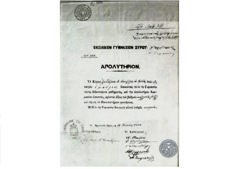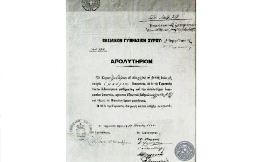Έπεσε στην αντίληψή μου ένα άλλο απολυτήριο από το Γυμνάσιό μου που έγραφε "διαγωγή κοσμία". Πολύ παλιό, πριν πάνω από ενάμιση αιώνα. Και το όνομα του μαθητή: Ελευθέριος Βενιζέλος!