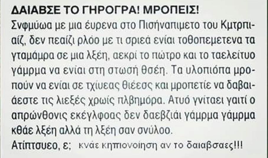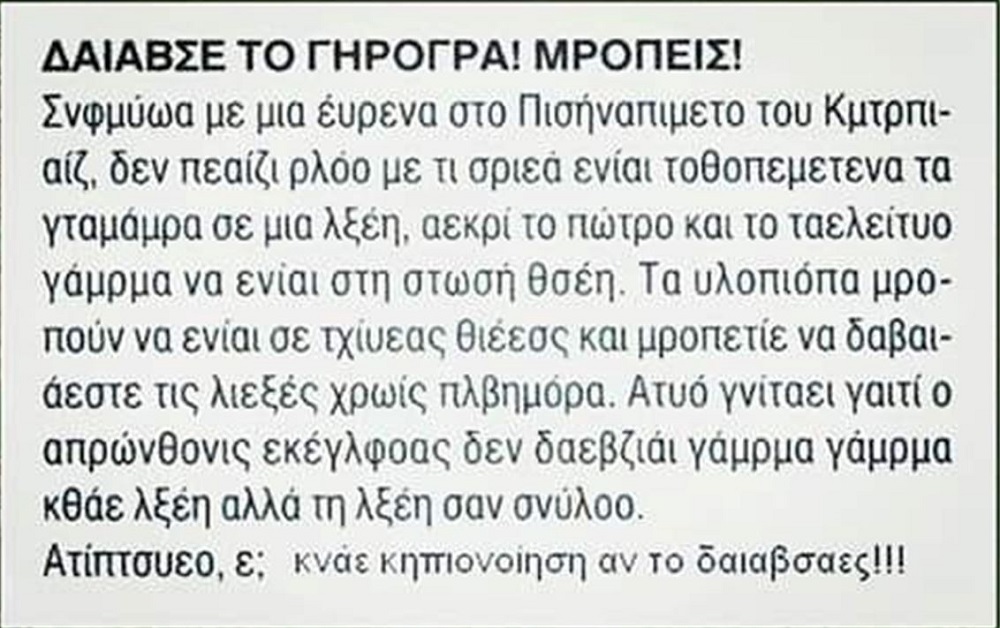 Μαθαίνομε να διαβάζουμε. Μετατρέπομε τα γραπτά σύμβολα που βλέπομε σε ήχο, ομιλία που την ακούμε. Ακούμε τις λέξεις που προφέρομε και τις μετατρέπομε σε έννοιες, αφού ήδη ξέρομε να μιλάμε. Βαθμιαία παύομε τη μεγαλόφωνη ανάγνωση και διαβάζομε ψιθυριστά, και αργότερα παύομε να κουνούμε τα χείλια μας διαβάζοντας. Έχει παρακαμφθεί ο ήχος και το γραπτό κείμενο γίνεται κατευθείαν ένα σύνολο εννοιών. Ανάλογα με τη σειρά τους, σχηματίζεται το νόημα, που είναι πια μια ολόκληρη πρόταση. Αλλά και η μετατροπή των λέξεων σε έννοιες γίνεται αντανακλαστικά ταχύτατα, καθώς αναγνωρίζομε πια ολοκληρωμένα σχέδια και όχι ένα-ένα τα γράμματα που τις αποτελούν. Μια επιστημονική έρευνα έδειξε ότι όταν μια λέξη που διαβάζομε μοιάζει με μια λέξη που αποτελεί έννοια, όπως αν είναι ίδια το πρώτο και το τελευταίο τους γράμμα και έχουν τα ίδια γράμματα, αναγνωρίζεται με μια ταχύτατη ματιά έστω και αν τα γράμματα που την αποτελούν έχουν οποιαδήποτε τυχαία σειρά (εικόνα άνω). Γι΄ αυτό, όταν ένα κείμενο είναι γραμμένο με λογικό τρόπο, δηλαδή με φωνητική γραφή (εικόνα κάτω), δυσκολευόμαστε να το διαβάσουμε.