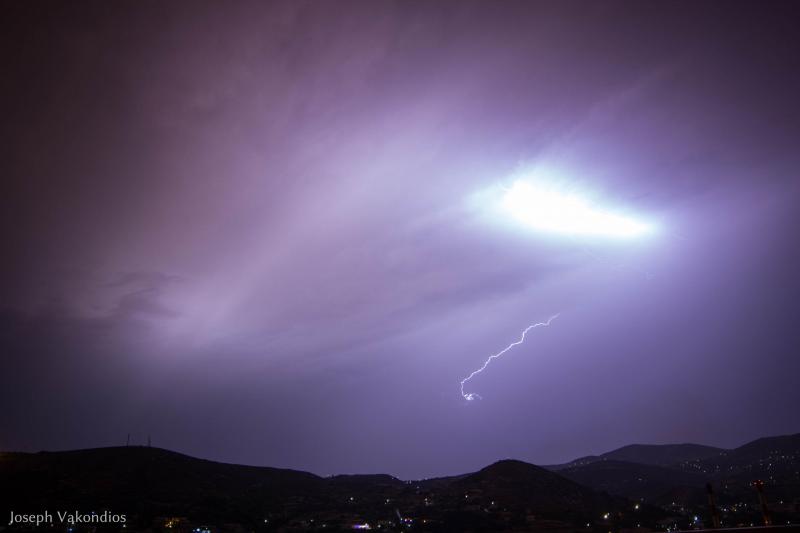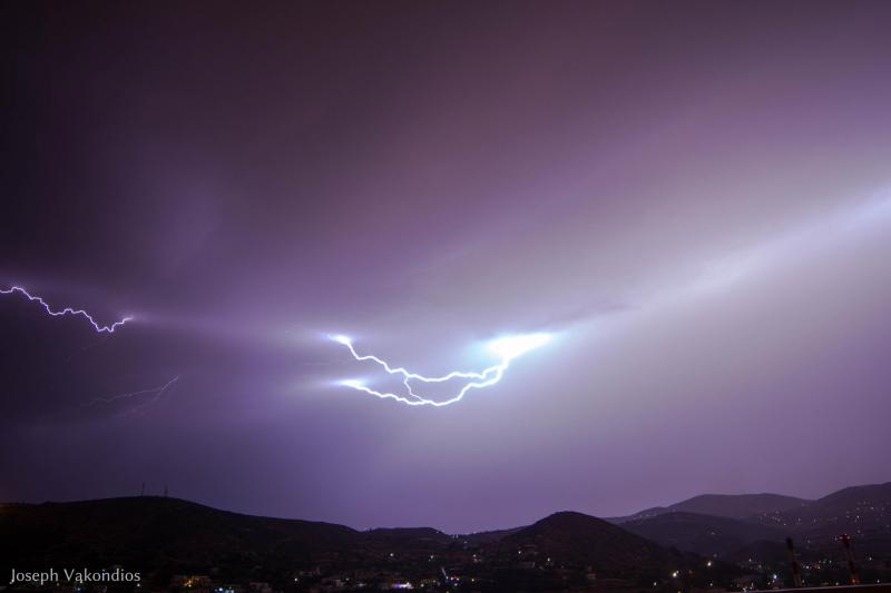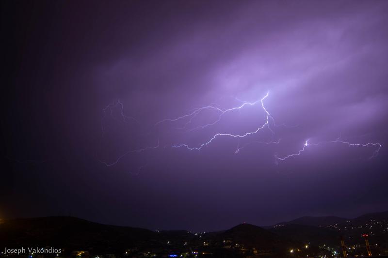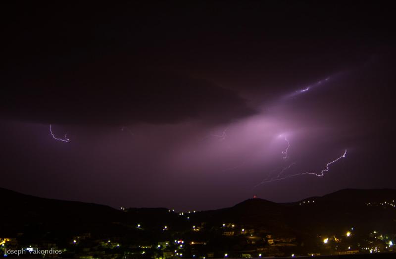 Μία από τις πιο εντυπωσιακές επιδείξεις δύναμης της μητέρας φύσης κατέγραψε χθες το βράδυ ο φακός της “Κοινής Γνώμης”, από τα γραφεία της Τυποκυκλαδικής στο Μάννα, λίγες μόνο ημέρες πριν από την έναρξη της καλοκαιρινής περιόδου.