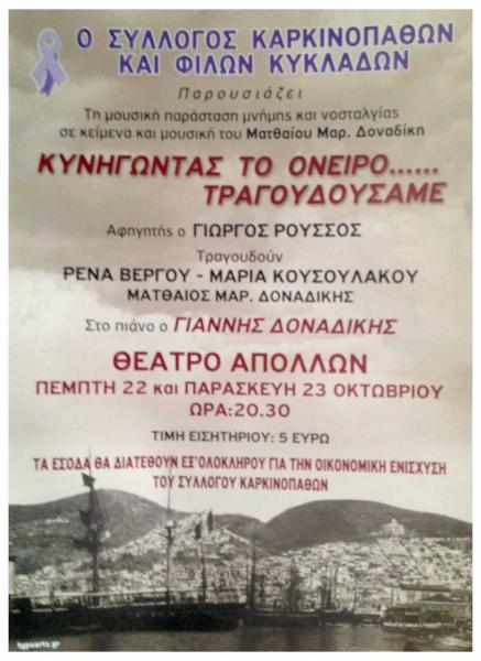 Τη μουσική παράσταση μνήμης και νοσταλγίας "Κυνηγώντας το όνειρο...τραγουδούσαμε" παρουσιάζει στο Θέατρο Απόλλων ο Σύλλογος Καρκινοπαθών και Φίλων Κυκλάδων την Πέμπτη 22 και την Παρασκευή 23 Οκτωβρίου στις 20:30.