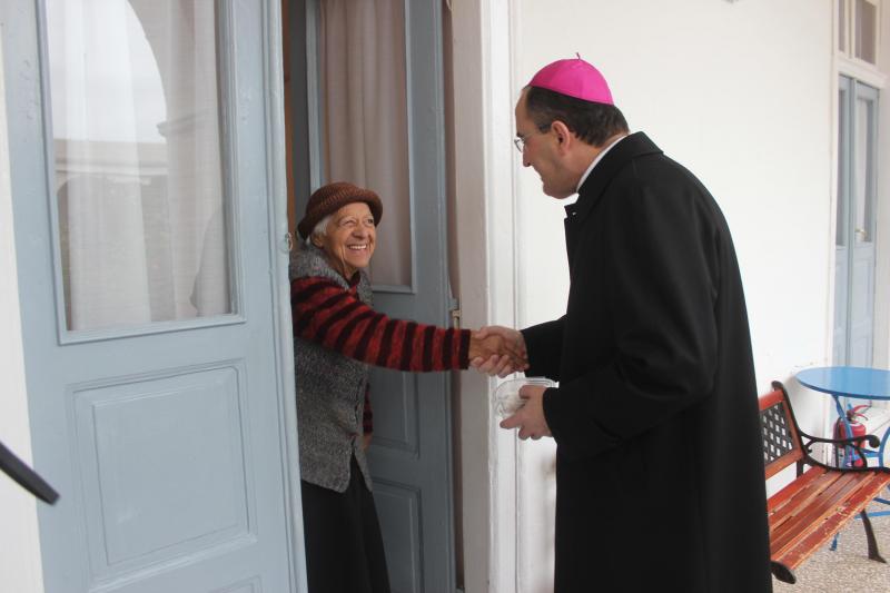 Κατά την επίσκεψή τους στα τρία ιδρύματα προστασίας του γήρατος στην Ερμούπολη, οι Επίσκοποι διένειμαν γλυκίσματα και αναμνηστικές ευλογίες στους τροφίμους τους, ενώ συνεχάρησαν τους υπευθύνους και τους εργαζομένους.