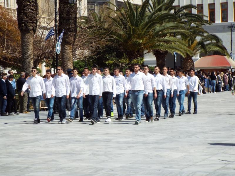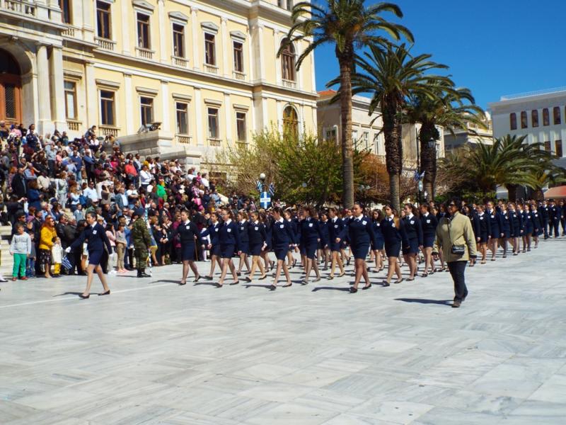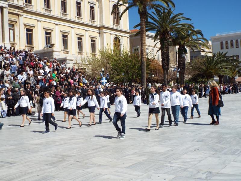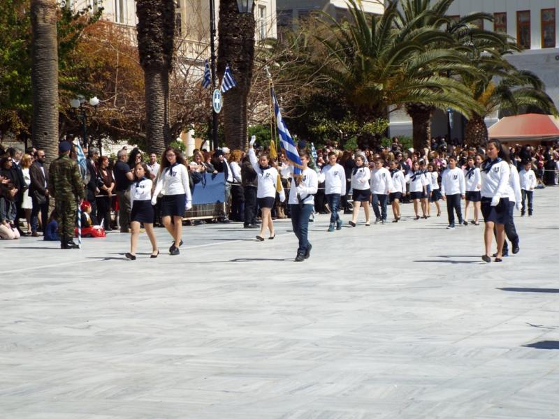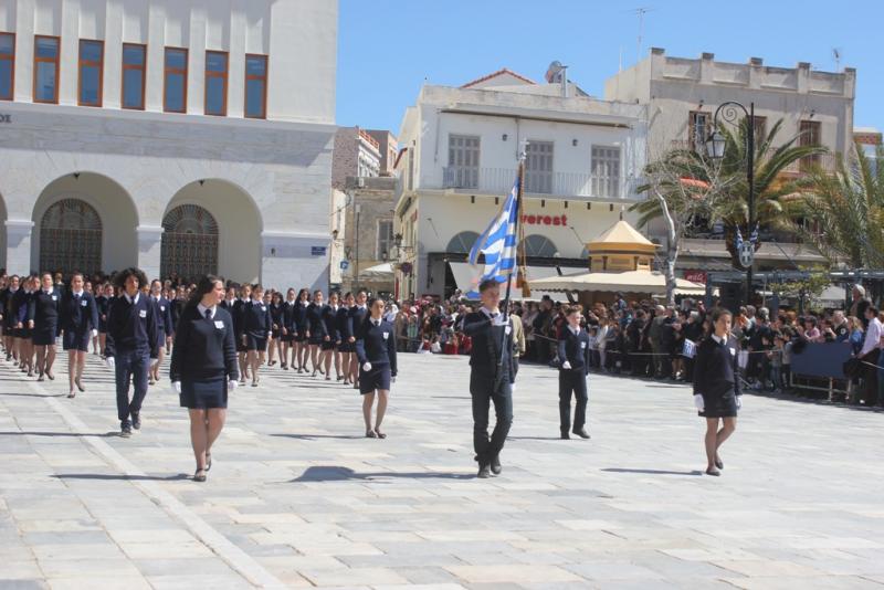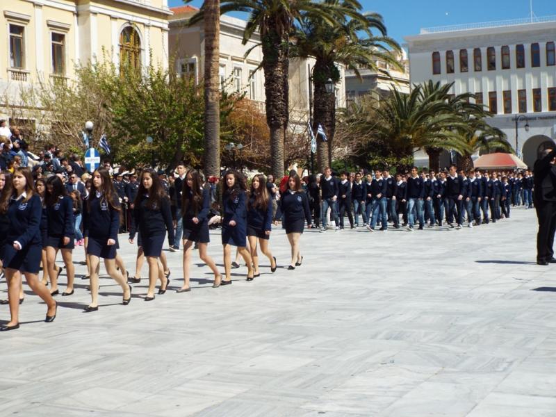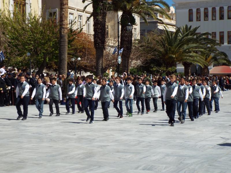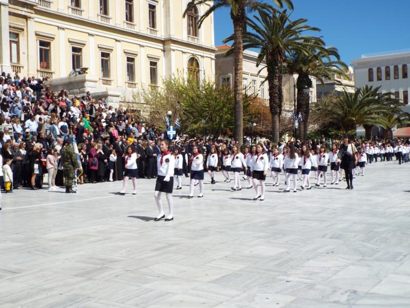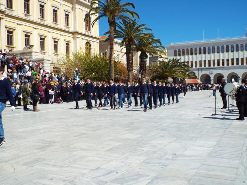 Μεγάλη ήταν και φέτος, με σύμμαχο τη συνεχιζόμενη καλοκαιρία, η προσέλευση του κόσμου της Σύρου στην κεντρική πλατεία της Ερμούπολης, ο οποίος χάρισε το θερμό του χειροκρότημα, στους μαθητές όλων των βαθμίδων εκπαίδευσης του νησιού, τους σπουδαστές της Ακαδημίας Εμπορικού Ναυτικού, τους εκπροσώπους του Λυκείου Ελληνίδων, του Ναυτικού Ομίλου Σύρου και άλλων Συλλόγων, Σωματείων και φορέων και αντιπροσωπίας των Κατηχητικών Σχολείων της Ιεράς Μητρόπολης Σύρου.