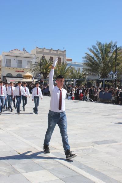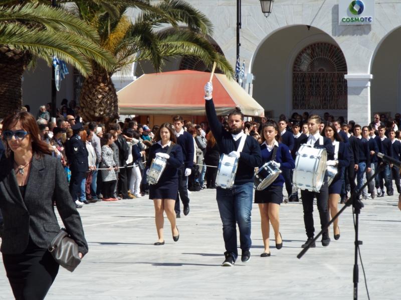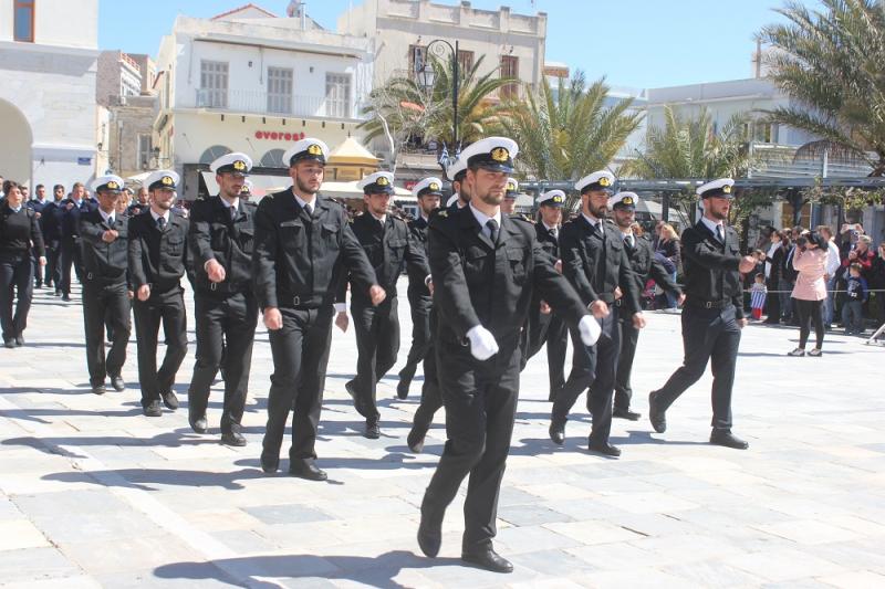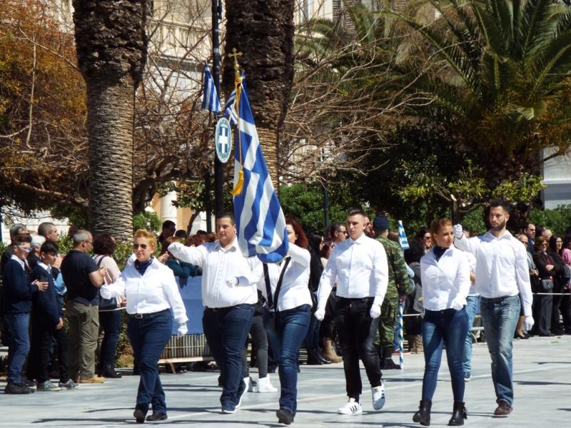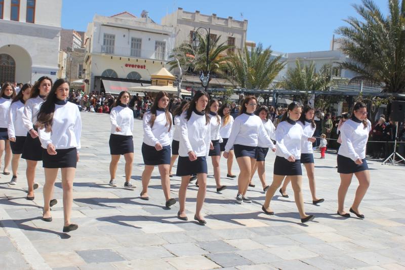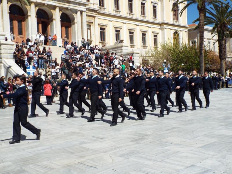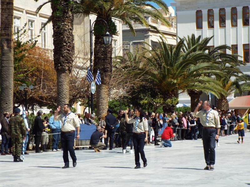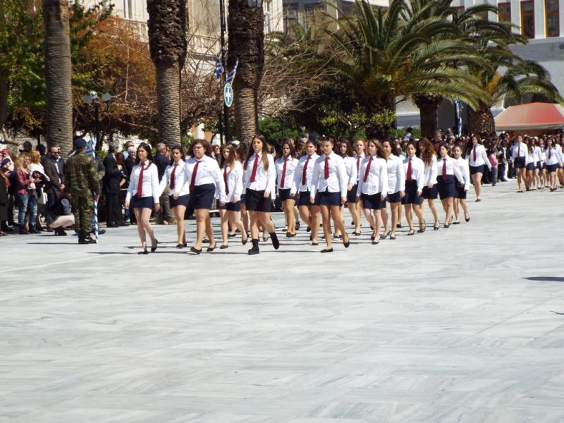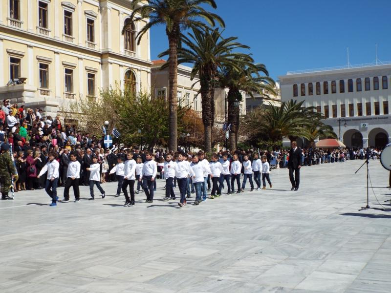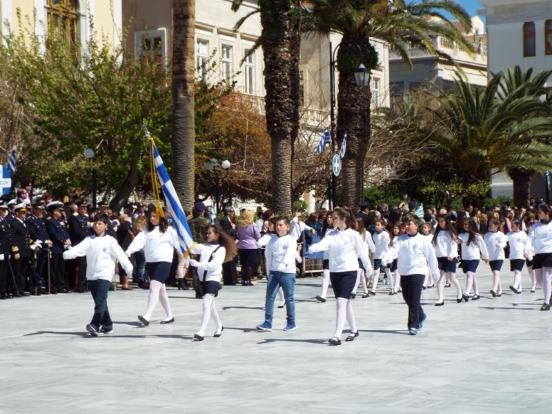 Μεγάλη ήταν και φέτος, με σύμμαχο τη συνεχιζόμενη καλοκαιρία, η προσέλευση του κόσμου της Σύρου στην κεντρική πλατεία της Ερμούπολης, ο οποίος χάρισε το θερμό του χειροκρότημα, στους μαθητές όλων των βαθμίδων εκπαίδευσης του νησιού, τους σπουδαστές της Ακαδημίας Εμπορικού Ναυτικού, τους εκπροσώπους του Λυκείου Ελληνίδων, του Ναυτικού Ομίλου Σύρου και άλλων Συλλόγων, Σωματείων και φορέων και αντιπροσωπίας των Κατηχητικών Σχολείων της Ιεράς Μητρόπολης Σύρου.