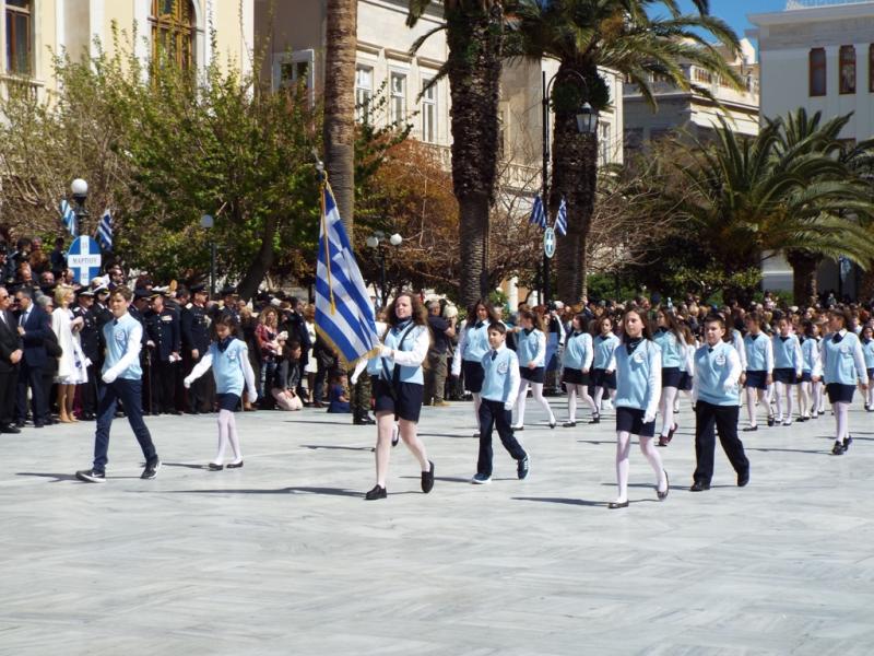 Της μαθητικής παρέλασης, την οποία παρακολούθησαν επίσης εκπρόσωποι της πολιτείας, ο Δήμαρχος Σύρου – Ερμούπολης, ο Αντιπεριφερειάρχης Κυκλάδων, ο Πρόεδρος και μέλη του Δημοτικού Συμβουλίου, εκπρόσωποι της Περιφέρειας Ν. Αιγαίου, καθώς και οι τοπικοί επικεφαλής των Αρχών και Σωμάτων Ασφαλείας του νησιού, προηγήθηκε επίσημη Δοξολογία, στον Ιερό Ναό του Αγίου Νικολάου, ενώ ο Πανηγυρικός τηςΗμέρας, εκφωνήθηκε από τον Αιδεσιμολογιώτατο Πρωτοπρεσβύτερο Εμμανουήλ Συρίγο, Προϊστάμενο Μητροπολιτικού Ναού Μεταμορφώσεως Σωτήρος Ερμουπόλεως.