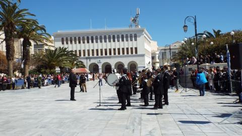 Με σύμμαχο τον ανοιξιάτικο ζεστό ήλιο, μαθητές, σπουδαστές, μέλη Σωματείων και Συλλόγων, απέδωσαν τιμή στον αγώνα των εθνικών ηρώων για την ελευθερία, ενάντια στον Τουρκικό ζυγό, καταθέτοντας στέφανα στα κυριότερα μνημεία της Ερμούπολης, καθώς και άλλων περιοχών του νησιού και παρελαύνοντας στην πλατεία Μιαούλη το πρωί της 25ης Μαρτίου, ενώπιον των επισήμων, από την Ορθόδοξη και την Καθολική Εκκλησία, όλες τις βαθμίδες της Αυτοδιοίκησης και της πολιτείας, όπως επίσης και του εκπροσώπου εκ μέρους της ελληνικής κυβέρνησης, υπουργό Οικονομίας και Ανάπτυξης, κ. Δημήτρη Παπαδημητρίου.