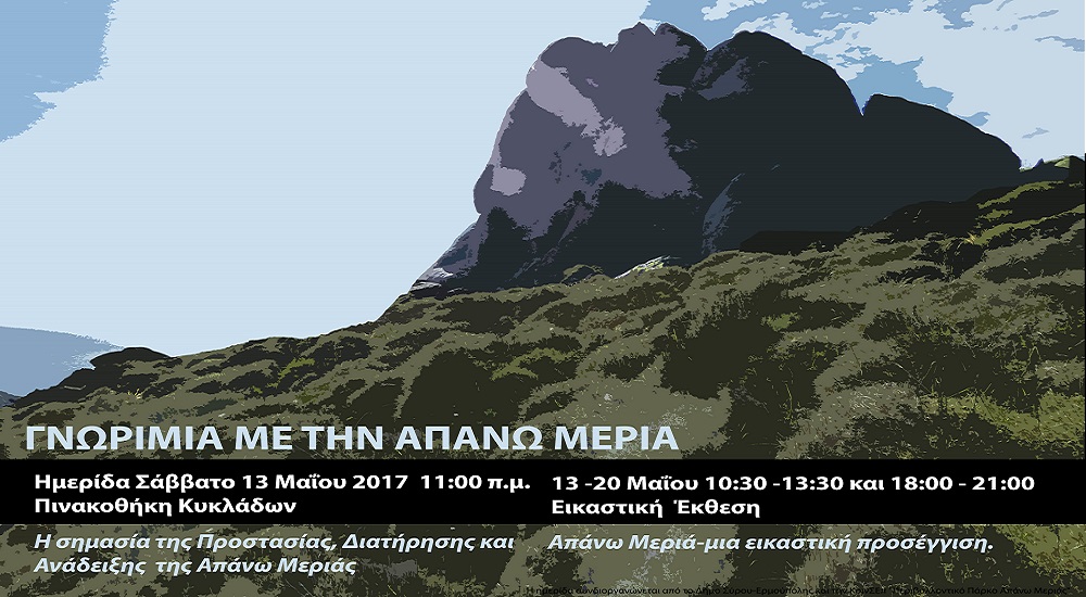 - Σάββατο 13 Μαΐου 2017, Ημερίδα “ ΓΝΩΡΙΜΙΑ ΜΕ ΤΗΝ ΑΠΑΝΩ ΜΕΡΙΑ ”Η σημασία της Προστασίας, Διατήρησης και Ανάδειξης της Απάνω Μεριάς, στην Πινακοθήκη Κυκλάδων