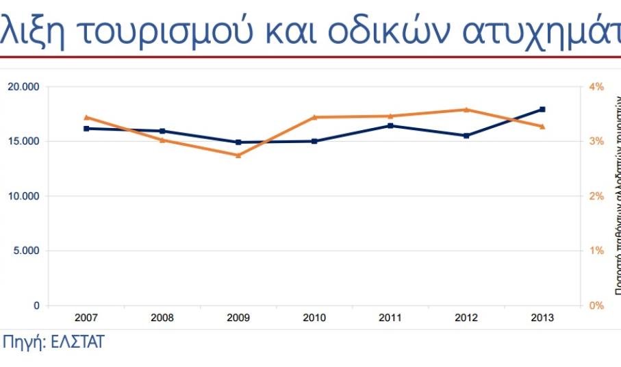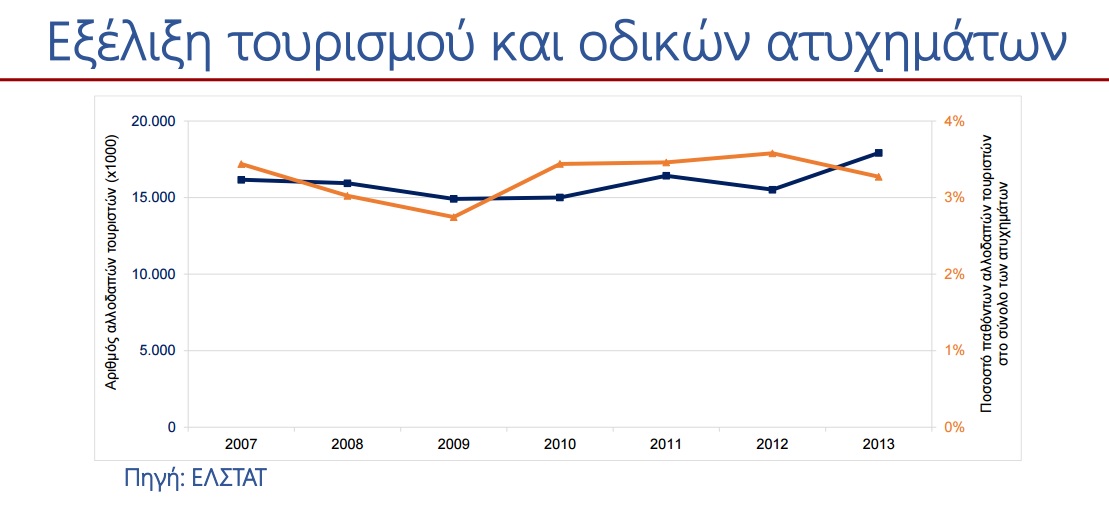 Σε ό,τι αφορά στα ατυχήματα, το ποσοστό των παθόντων αλλοδαπών τουριστών στο σύνολο των ατυχημάτων για την περίοδο 2007-2013 κυμαίνεται περίπου στο 3,5% και η τάση του ποσοστού των παθόντων αλλοδαπών τουριστών ακολουθεί την τουριστική κίνηση.