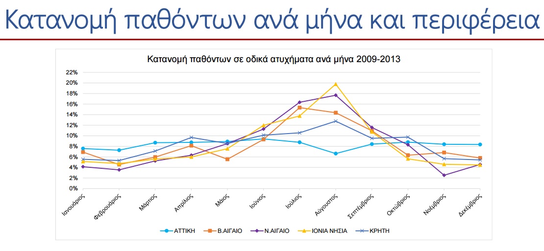 Ο αριθμός των νεκρών σε οδικά ατυχήματα στην Ελλάδα αυξάνεται τους θερινούς μήνες, ενώ τα οδικά ατυχήματα αποτελούν βασικό πρόβλημα των Ελλήνων και ξένων τουριστών. Ταυτόχρονα, αυξάνεται και ο αριθμός των παθόντων σε οδικά ατυχήματα κατά τους θερινούς μήνες στις τουριστικές περιοχές σε αντίθεση με την Αττική, με τα νησιά του Ιονίου, του Ν. Αιγαίου και την Κρήτη να καταγράφουν το μεγαλύτερο ποσοστό μέσα στον Αύγουστο, αλλά και το υψηλότερο ποσοστό αλλοδαπών παθόντων, σε σχέση με το σύνολο της χώρας.