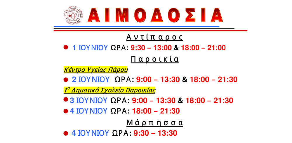 Ο Σύλλογος Εθελοντών Αιμοδοτών Πάρου - Αντιπάρου, διοργανώνει για τον μήνα Ιούνιο αιμοδοσία και στα δύο νησιά.