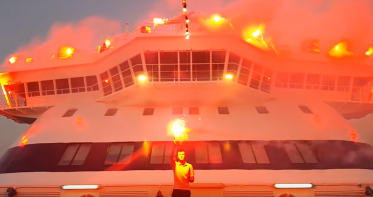 Με καπνογόνα στα χέρια οι ναύτες του πλοίου, φωτοβολίδες και καπνογόνα, το πλοίο Νήσος Μύκονος και όσοι βρίσκονταν ως επιβάτες σε αυτό, συμμετείχαν με το δικό τους τρόπο στις εορταστικές εκδηλώσεις που διεξήχθησαν παρουσία του Μητροπολίτη Σμύρνης, Βαρθολομαίου.(dokari)