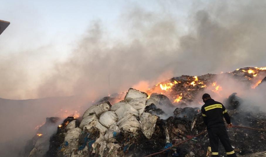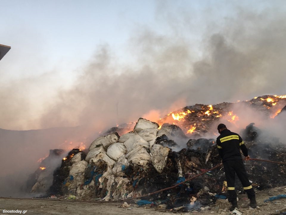 Για περίπου τρία εικοσιτετράωρα καίει η πυρκαγιά, που ξέσπασε στην περιοχή φύλαξης των δεματοποιημένων απορριμμάτων του Δήμου Τήνου
