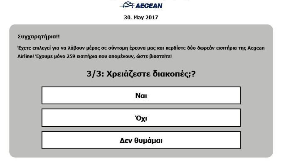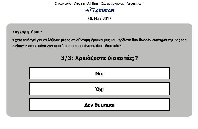 Ανακοίνωση: Θα θέλαμε να σας ενημερώσουμε πως αυτή τη στιγμή εμφανίζεται στο διαδίκτυο ψεύτικη ιστοσελίδα με παράνομη και παραπλανητική χρήση σημάτων, επωνυμίας, φωτογραφιών και λοιπών στοιχείων της Εταιρείας μας μέσω της οποίας διενεργεί έρευνα και παραπλανητικό διαγωνισμό http://qq5mx92.us/AegeanAirlines/?kZh8cYK και http://www.aegeanair.com-grabnow-a.us/?Dljyk9z