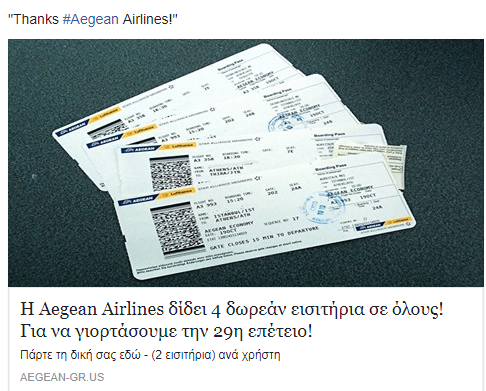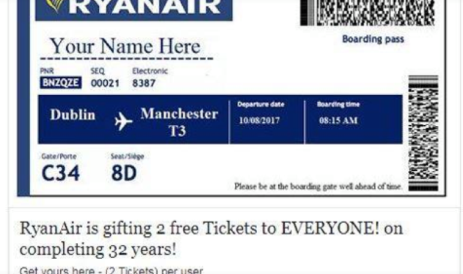 Οι επιτήδειοι πίσω από την απάτη, χρησιμοποιούν τα ονόματα και τα χρώματα των εταιρειών Aegean Airlines, Easyjet, Quantas,Ryanair και άλλες, σε χορηγούμενες αναρτήσεις, που υπόσχονται δωρεάν εισιτήρια μέσω διαγωνισμού, ενώ όταν ο χρήστης πατήσει στο σύνδεσμο, του ζητείται να κοινοποιήσει στην προσωπική του σελίδα το σύνδεσμο του διαγωνισμού και στη συνέχεια να απαντήσει σε σύντομη έρευνα τριών ερωτήσεων, ενώ επίσης ζητούνται προσωπικά στοιχεία, τα οποία και σε καμία περίπτωση ΔΕΝ πρέπει να δώσει, καθώς τα στοιχεία χρησιμοποιούνται από τους απατεώνες.