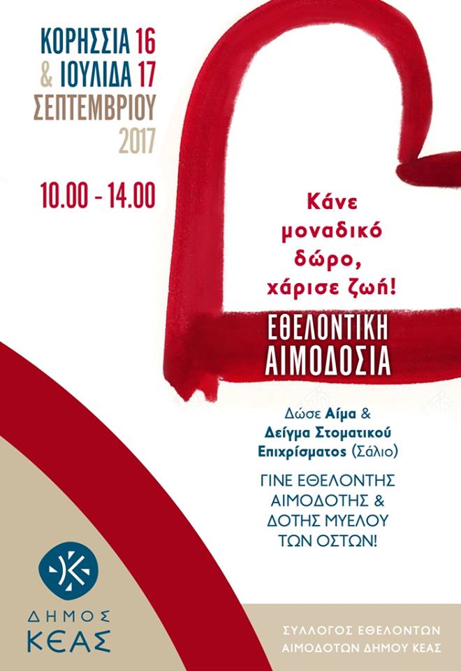 Ο Δήμος Κέας και ο Σύλλογος Εθελοντών Αιμοδοτών του διοργανώνουν εθελοντική αιμοδοσία και σας καλούν για ακόμη μία φορά να κάνετε ένα μοναδικό δώρο ζωής. Γίνε κι εσύ εθελοντής αιμοδότης και δότης μυελού των οστών. Είναι εύκολο! Δώσε λίγα μόνο λεπτά από το χρόνο σου και κάνε μία πράξη αγάπης, σώσε μία ζωή!