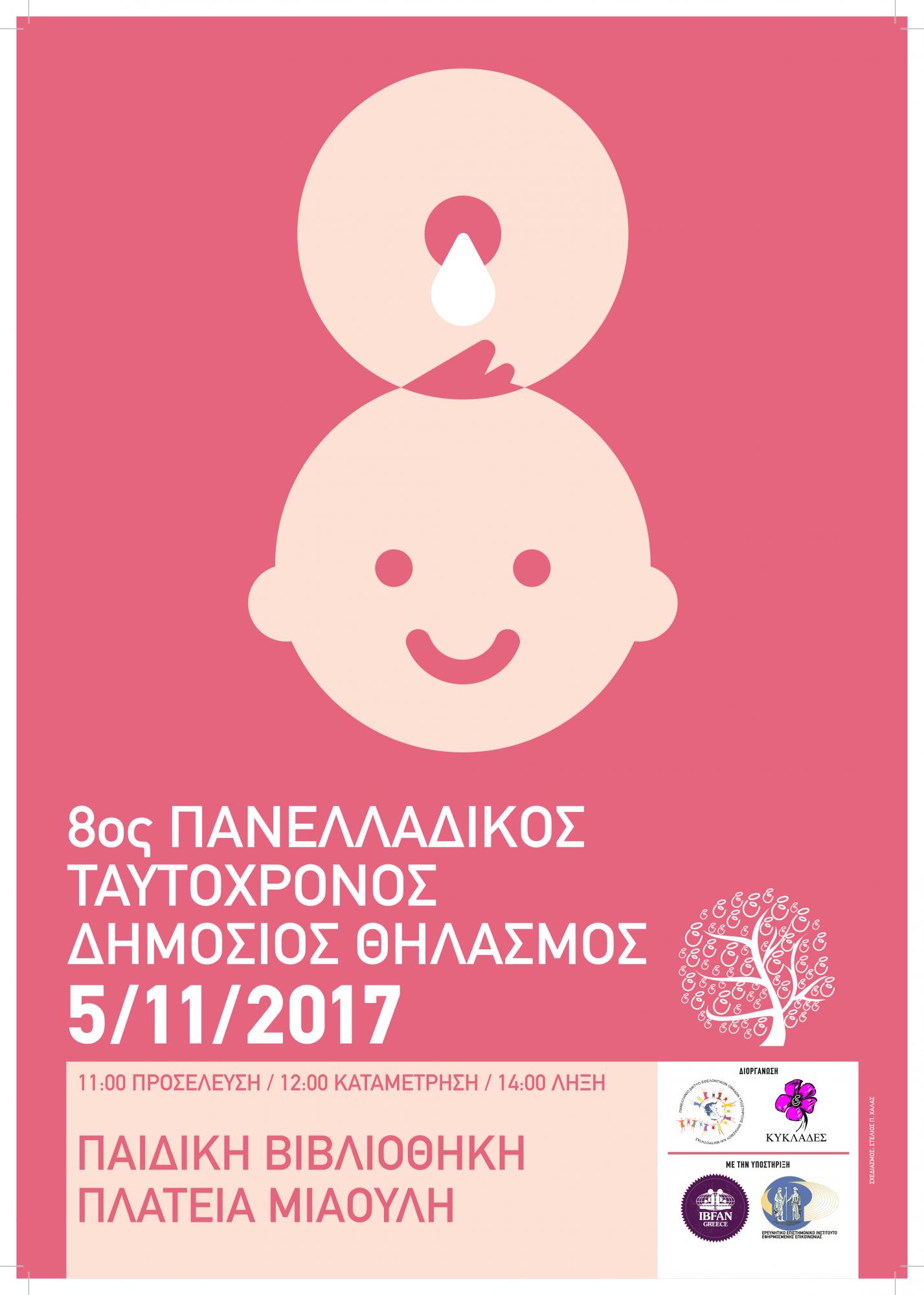 Το Πανελλήνιο Δίκτυο Υποστηρικτών Ομάδων Υποστήριξης Μητρικού Θηλασμού και Μητρότητας δοργανώνει τον 8ο Πανελλαδικό Ταυτόχρονο Δημόσιο Θηλασμό σε περισσότερες από 50 πόλεις της Ελλάδας.