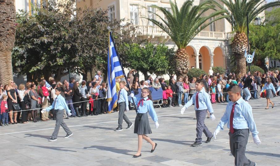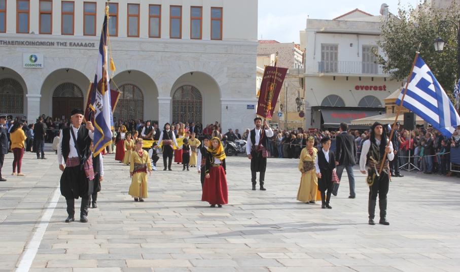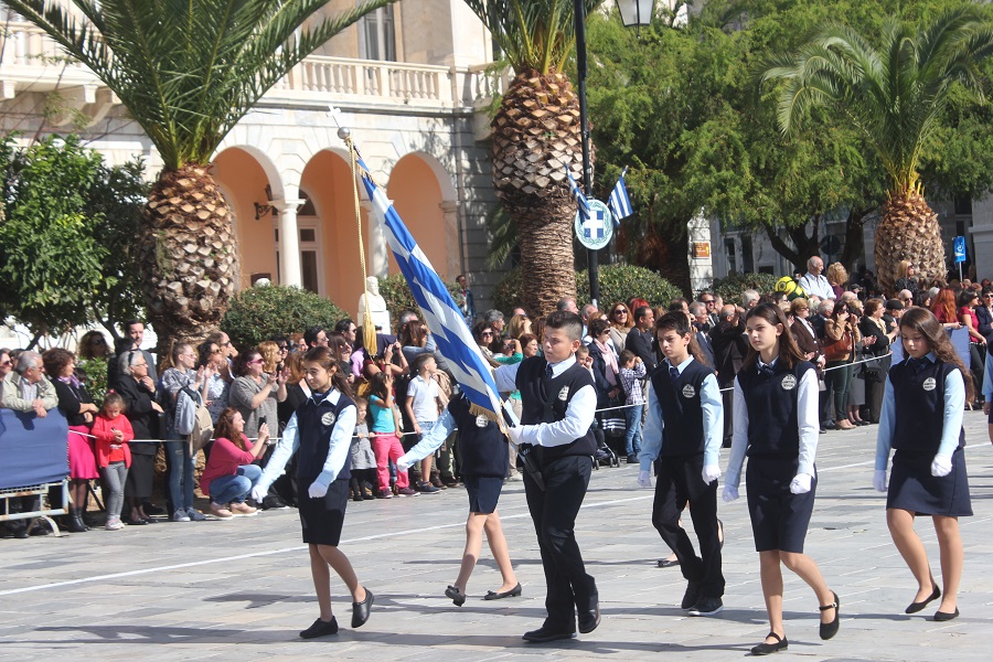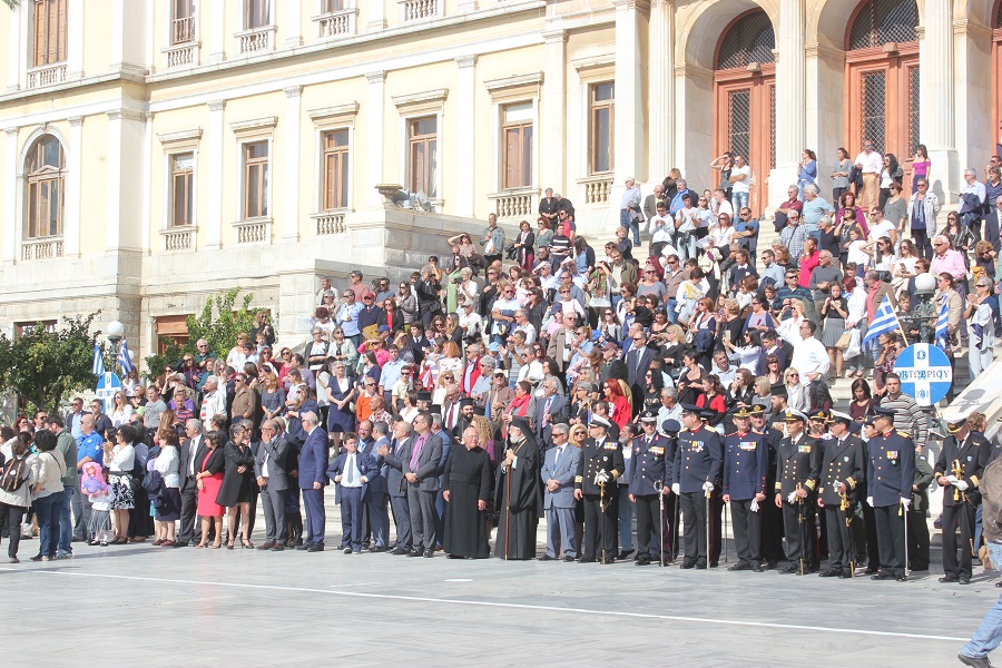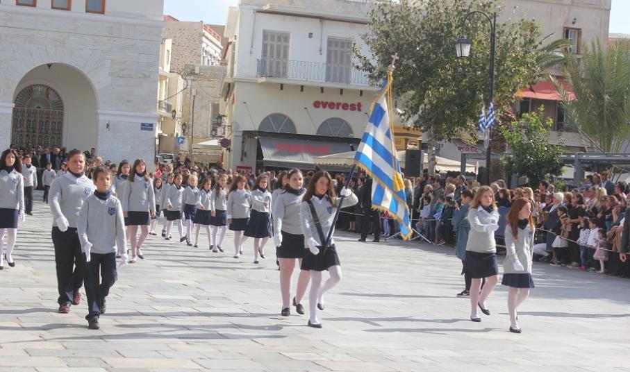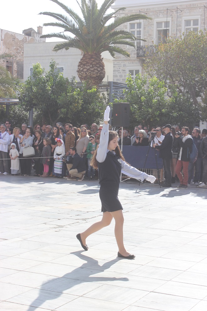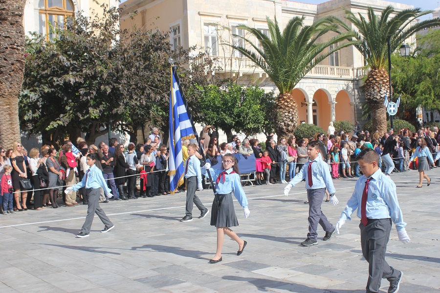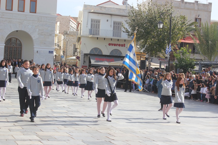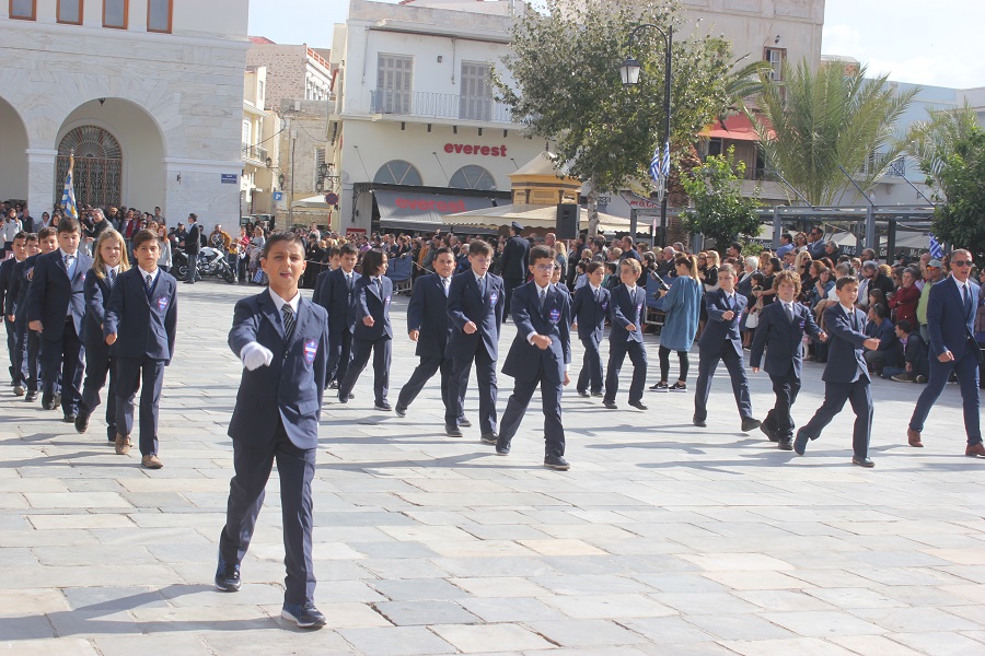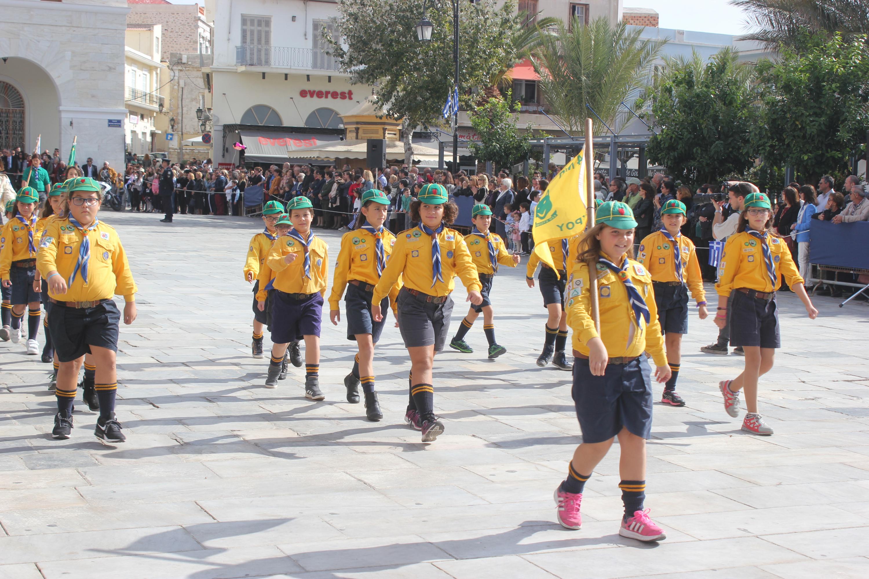 Το εγκάρδιο χειροκρότημα των πολιτών της Σύρου, οι οποίοι συνέρρευσαν στην Πλατεία Μιαούλη για την κορύφωση του εορτασμού της Εθνικής Επετείου της 28ης Οκτωβρίου, απέσπασαν μαθητές, σπουδαστές, πρόσκοποι, μέλη πολιτιστικών και αθλητικών συλλόγων, καθώς και διμοιρία του Τάγματος Εθνοφυλακής Ερμούπολης, κατά την πατροπαράδοτη παρέλαση.