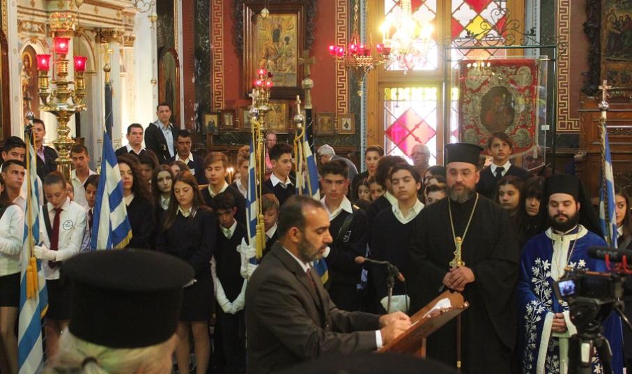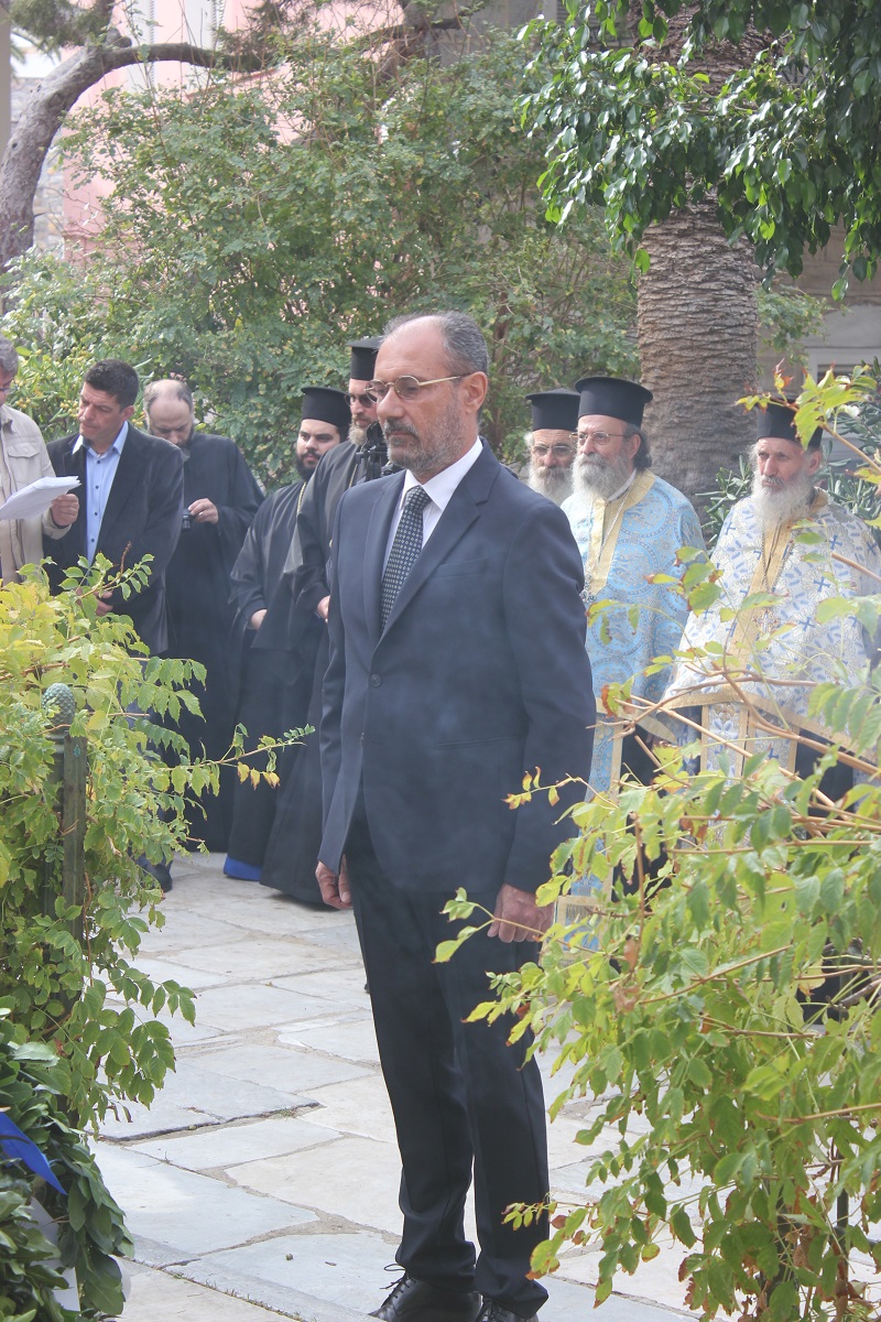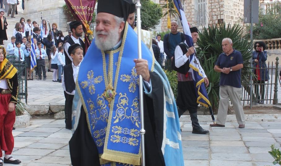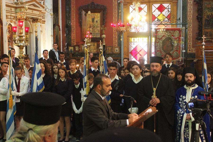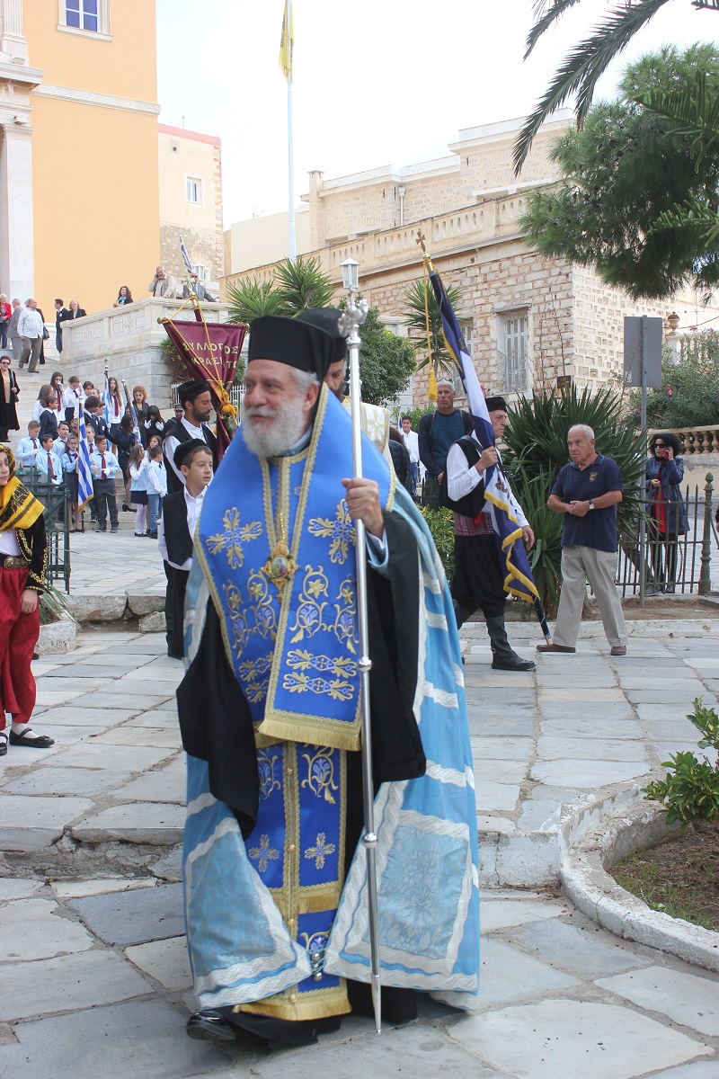 Στο πλαίσιο των προγραμματισμένων εκδηλώσεων, σήμερα το πρωί τελέστηκε στον Ιερό Ναό Αγίου Νικολάου Επίσημη Δοξολογία, χοροστατούντος του Σεβασμιωτάτου Μητροπολίτη Σύρου κ. Δωροθέου Β' και παρουσία μαθητικών αντιπροσωπειών, αιρετών και εκπροσώπων των τοπικών αρχών και των σωμάτων ασφαλείας, Μετά το πέρας της Δοξολογίας εκφωνήθηκε ο πανηγυρικός της ημέρας από τον Διευθυντή του 1ου Γυμνασίου Σύρου κ. Απόστολο Ποντίκα και ακολούθησε Επιμνημόσυνη Δέηση και κατάθεση στεφάνων στο Εθνικό Ηρώο της πόλης έναντι του Ιερού Ναού.
