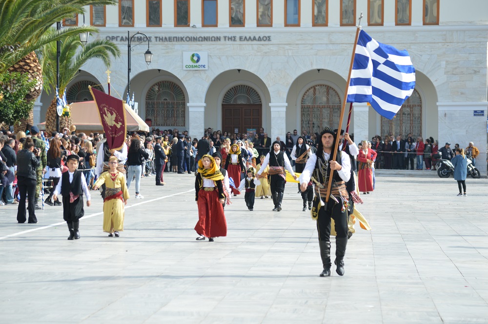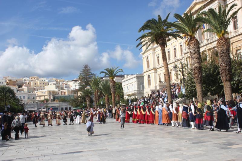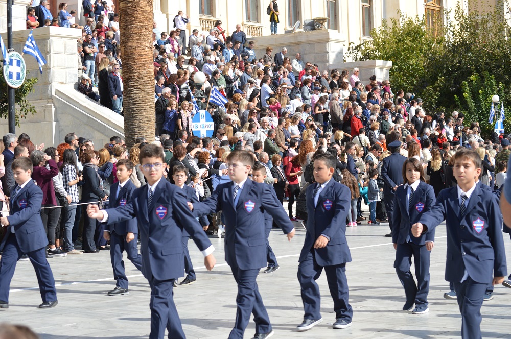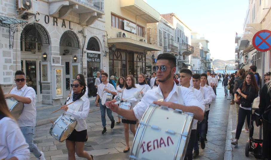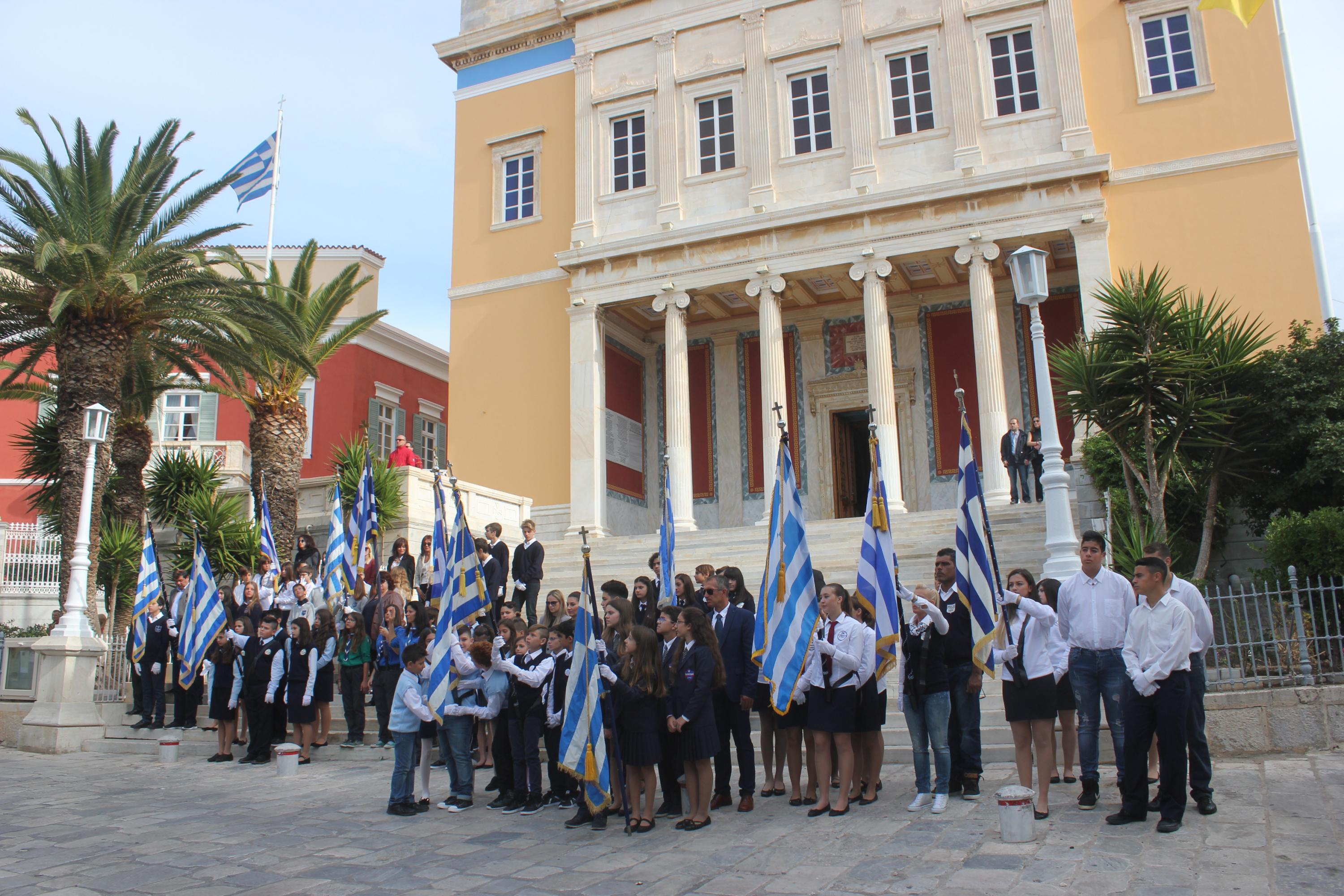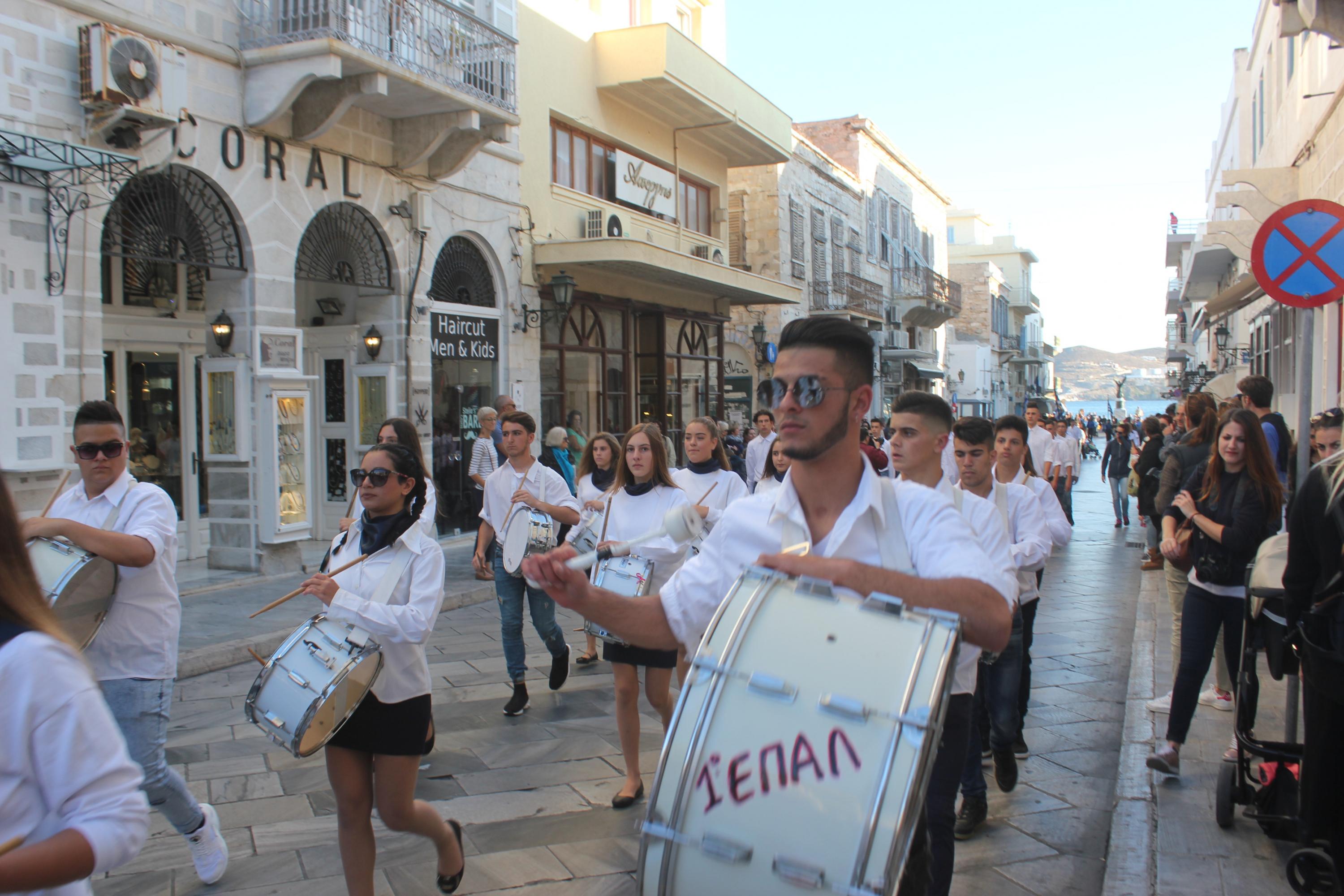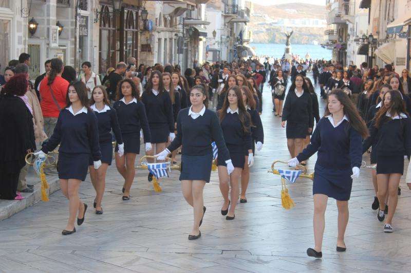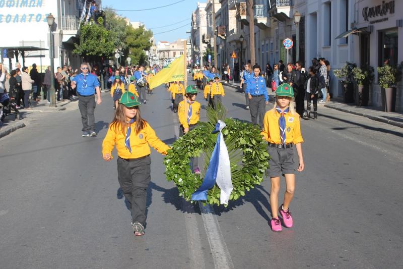 Το εγκάρδιο χειροκρότημα των πολιτών της Σύρου, οι οποίοι συνέρρευσαν στην Πλατεία Μιαούλη για την κορύφωση του εορτασμού της Εθνικής Επετείου της 28ης Οκτωβρίου, απέσπασαν μαθητές, σπουδαστές, πρόσκοποι, μέλη πολιτιστικών και αθλητικών συλλόγων, καθώς και διμοιρία του Τάγματος Εθνοφυλακής Ερμούπολης, κατά την πατροπαράδοτη παρέλαση.