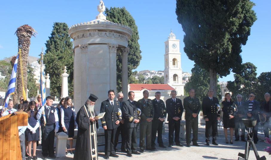 Παραμονή της Εθνικής Επετείου, τελέστηκε επιμνημόσυνη δέηση στο Κοιμητήριο του Ι.Ν. Αγίου Γεωργίου, παρουσία εκπροσώπων των τοπικών αρχών και των σωμάτων ασφαλείας, της Ακαδημίας Εμπορικού Ναυτικού, και μαθητών των τελευταίων τάξεων του 4ου  και του 6ου  Δημοτικού Σχολείου Ερμούπολης. Ακολούθησε η ανάγνωση του καταλόγου των θυμάτων και κατάθεση στεφάνου από τον Ανώτερο Διοικητή Φρουράς Σύρου.