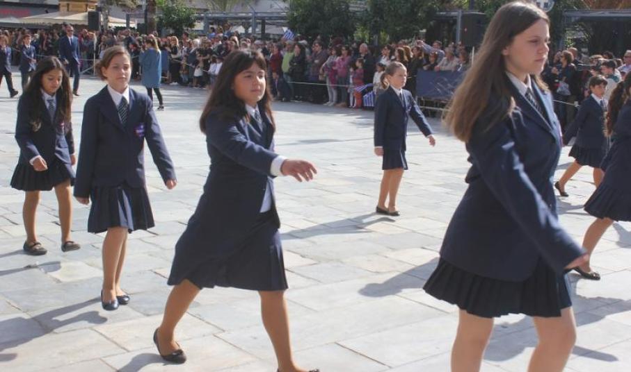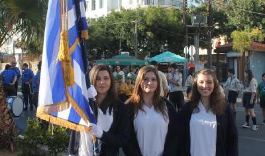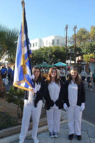 Την παρέλαση άνοιξε το Λύκειο Ελληνίδων Σύρου, στο οποίο η Ιερά Μητρόπολη Σύρου εμπιστεύτηκε τη σημαία του Συνδέσμου Αναπήρων και Θυμάτων Πολέμου. Το κειμήλιο αυτό φυλάσσεται στον Ιερό Ναό Κοιμήσεως της Θεοτόκου και κάθε χρόνο παρελαύνει, φερόμενο από νέους και νέες του Λυκείου και υπενθυμίζοντας σε όλους εμάς τις θυσίες και τους αγώνες των πατέρων μας, καλώντας μας να τους μιμηθούμε. Το Λύκειο Ελληνίδων Σύρου ιδρύθηκε το 1915 και είναι το πρώτο περιφερειακό Λύκειο της Ελλάδας. Παραμένει πιστό στους ιδρυτικούς καταστατικούς σκοπούς του, αυτούς της διάσωσης, διαφύλαξης και διάδοσης της παράδοσης και της εθνικής μας κληρονομιάς, καθώς και της προώθηση των δικαιωμάτων της γυναίκας, της μητέρας κα των παιδιών.