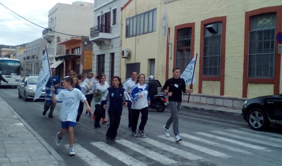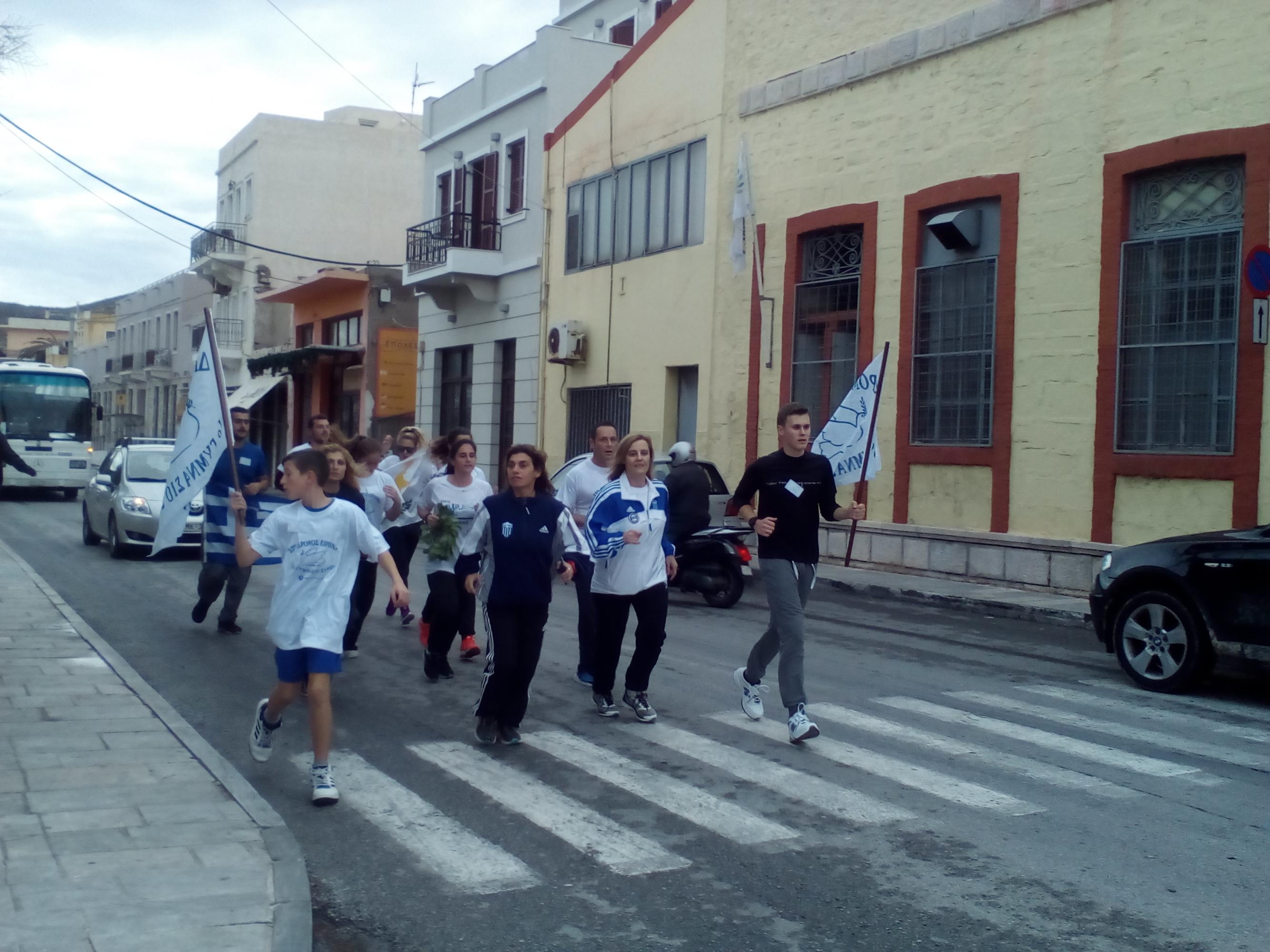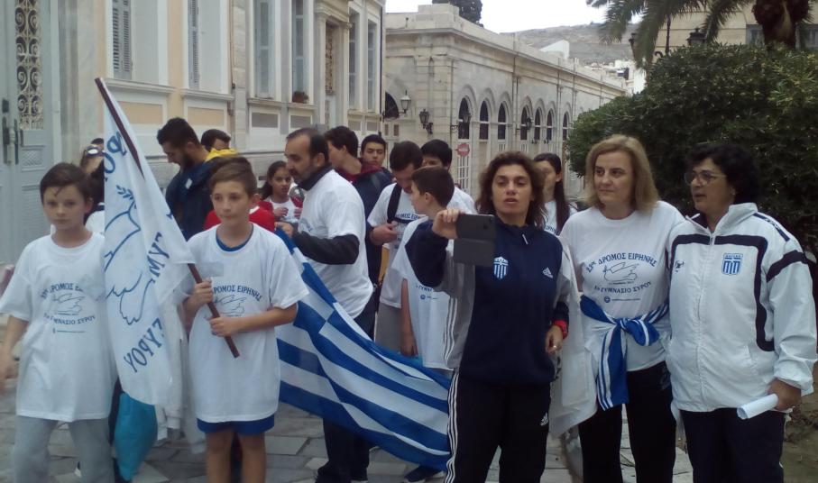 Μαθητές από όλα τα σχολεία της Δευτεροβάθμιας Εκπαίδευσης της Σύρου, καθώς και σπουδαστές της Σχολής του Εμπορικού Ναυτικού διένυσαν την απόσταση των 21,5 χλμ, η οποία καλύφθηκε διαδοχικά, υπό μορφή σκυταλοδρομίας, ανά πεντακόσια μέτρα, εκτός από το τελευταίο κομμάτι της διαδρομής το οποίο διανύθηκε από όλους τους συμμετέχοντες.