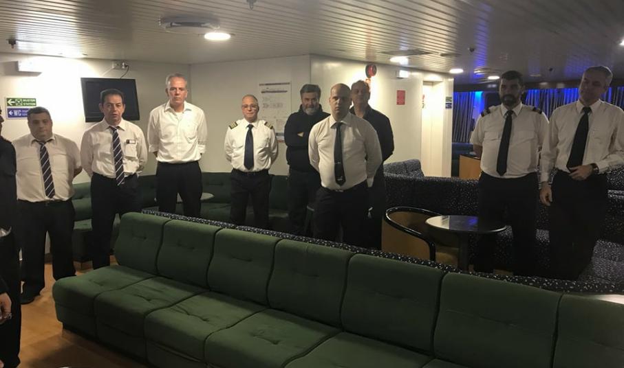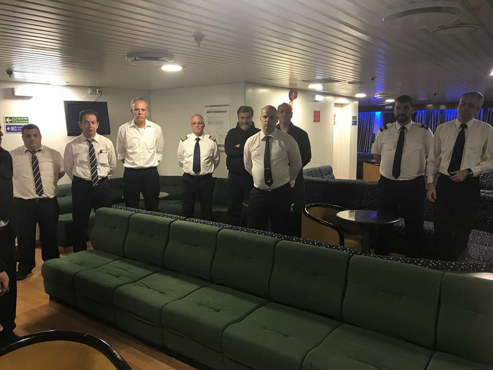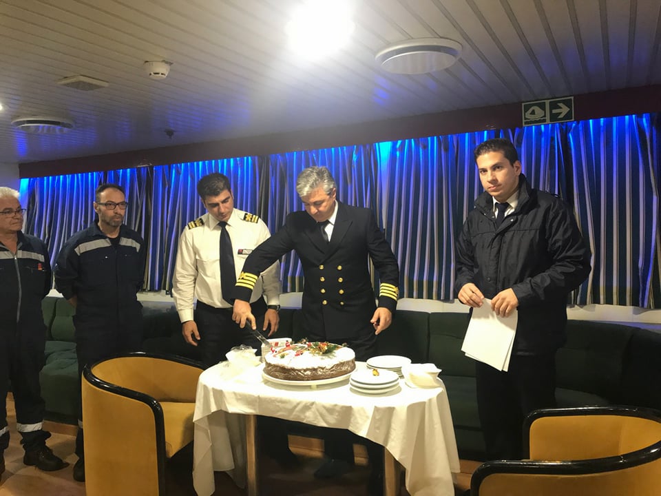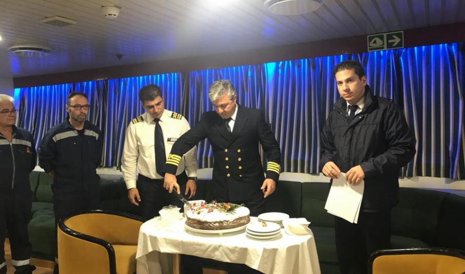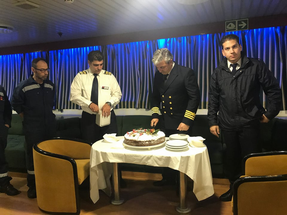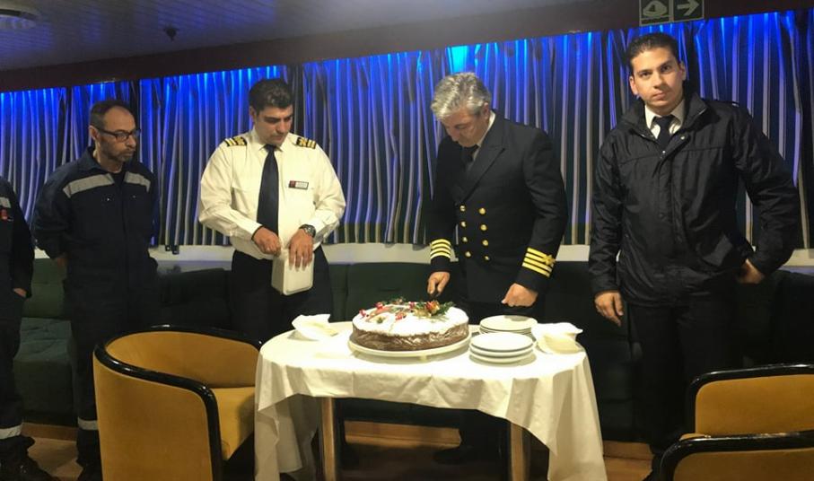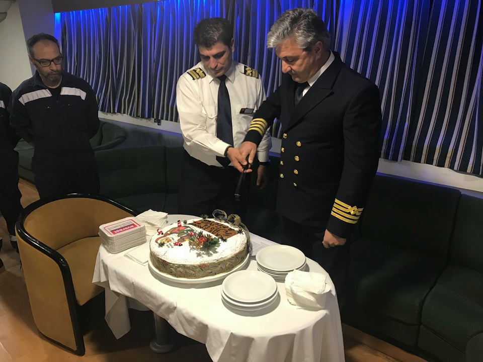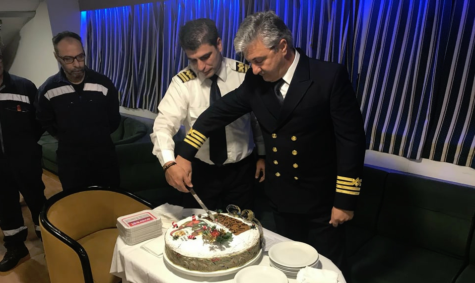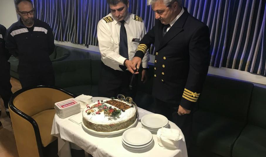 Όπως παραδοσιακά γίνεται, οι δύο πλοίαρχοι κ. Στυλιανός Περιστεράκης και κ. Ιωάννης Σιγάλας, συγκέντρωσαν το πλήρωμα στο σαλόνι του πλοίου για την κοπή της πίτας. Στο σύντομο λόγο που εκφώνησε ο ένας εκ των δύο πλοιάρχων κ. Περιστεράκης, ευχήθηκε μια χρονιά γεμάτη με ελπίδα, όνειρα και προσδοκίες καθώς και προσωπικές και επαγγελματικές επιτυχίες.
