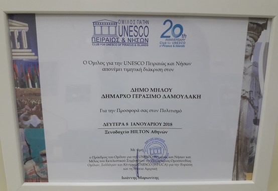 Στο πλαίσιο των τριήμερων εκδηλώσεων -από την Κυριακή 7 έως και την Τρίτη 9 Ιανουαρίου για τον εορτασμό της 20ής επετείου του Ομίλου UNESCO Πειραιώς και Νήσων, που πραγματοποιήθηκε στο ξενοδοχείο Χίλτον της Αθήνας, απονεμήθηκε τιμητική διάκριση στο Δήμο Μήλου και τον Δήμαρχο Μήλου Γεράσιμο Δαμουλάκη, για την προσφορά του στον πολιτισμό.