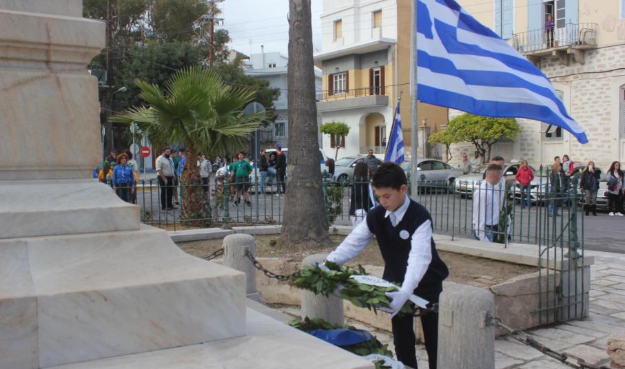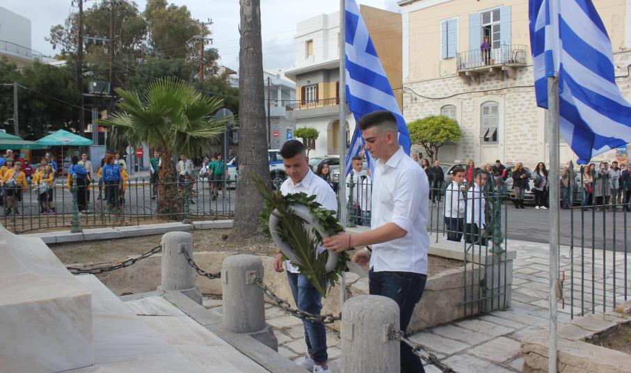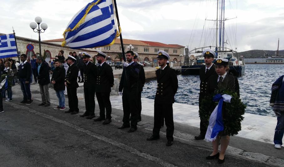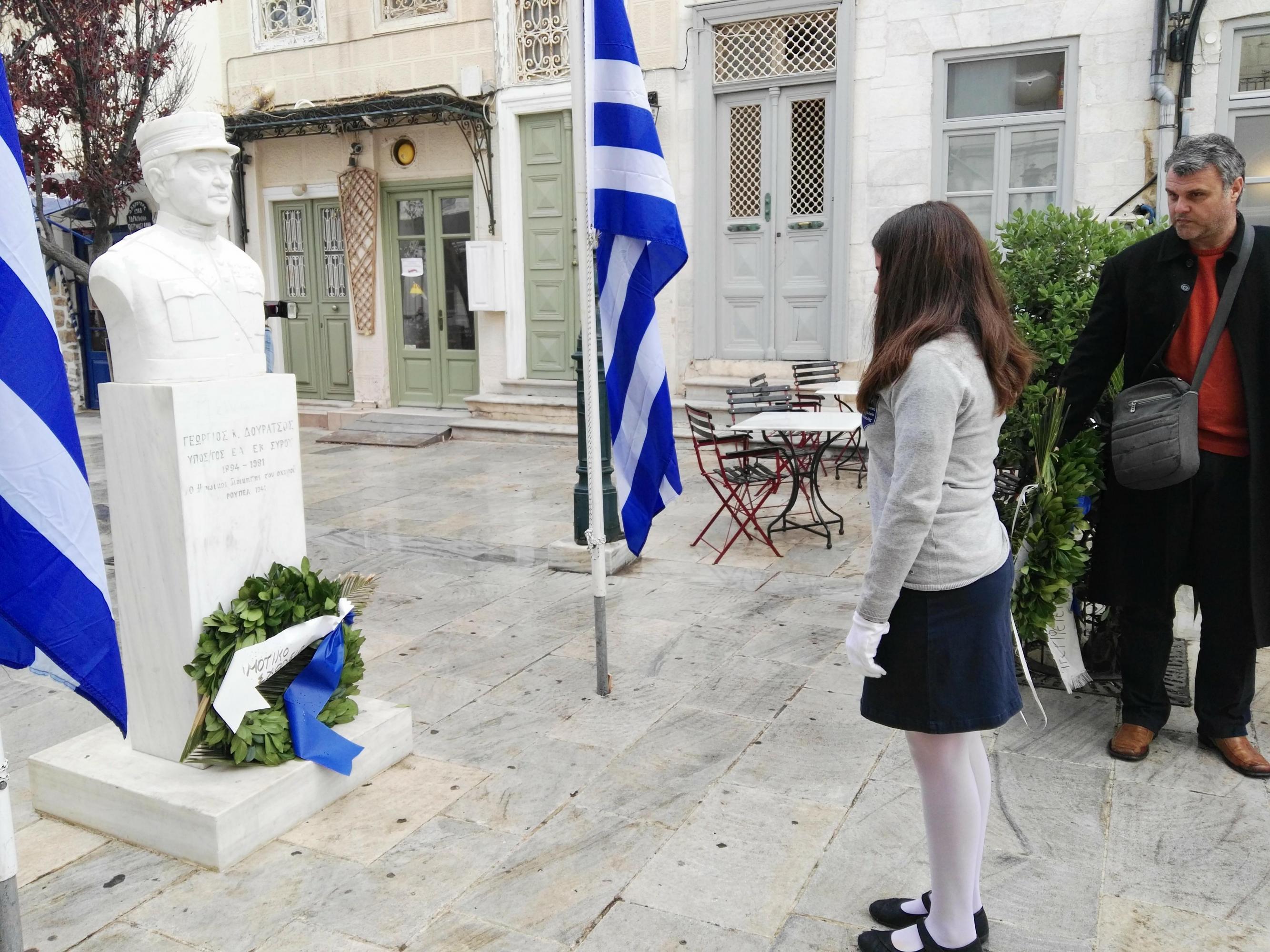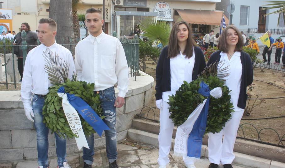 Στη συνέχεια, ακολούθησε κατάθεση στεφάνων στο Μνημείο Πεσόντων Ιερολοχιτών από μαθητές του 1ου Γυμνασίου Σύρου, στο Μνημείο Εθνικής Αντίστασης από μαθητές του 2ου και 3ου Δημοτικού Σχολείου Ερμούπολης και στην προτομή του Πυροπολητή Κανάρη από σπουδαστές της Ακαδημίας Εμπορικού Ναυτικού Σύρου, μαθητές του 2ου Γυμνασίου Σύρου, του Εσπερινού Γυμνασίου (με τάξεις Λυκείου) Σύρου και από το Ναυτικό Όμιλο Σύρου.