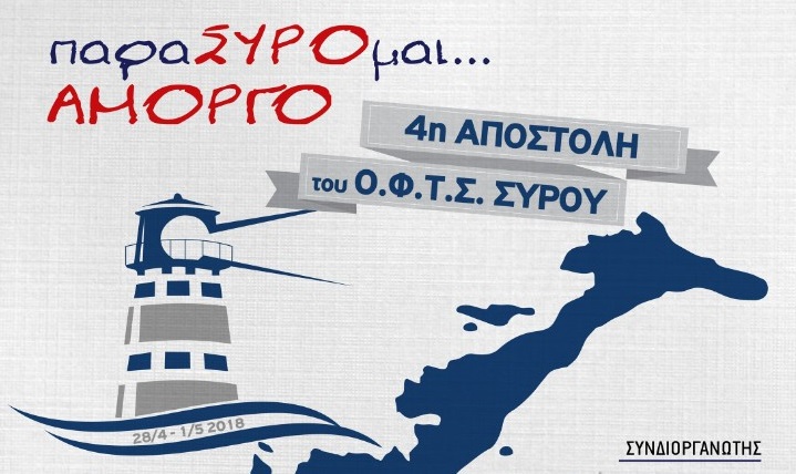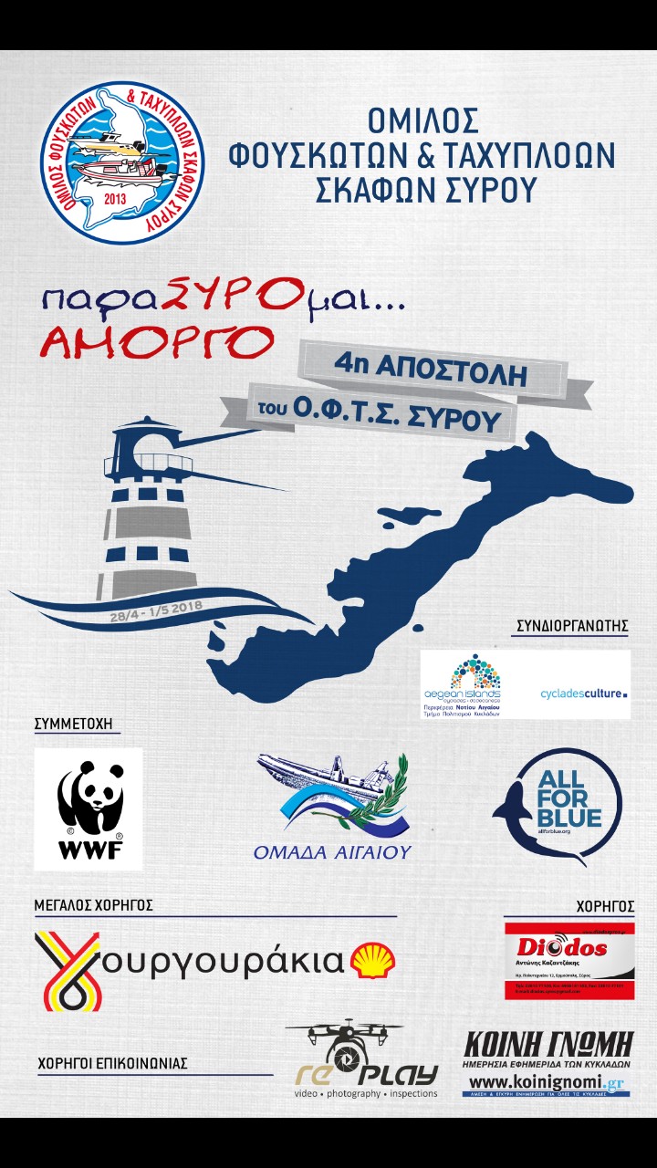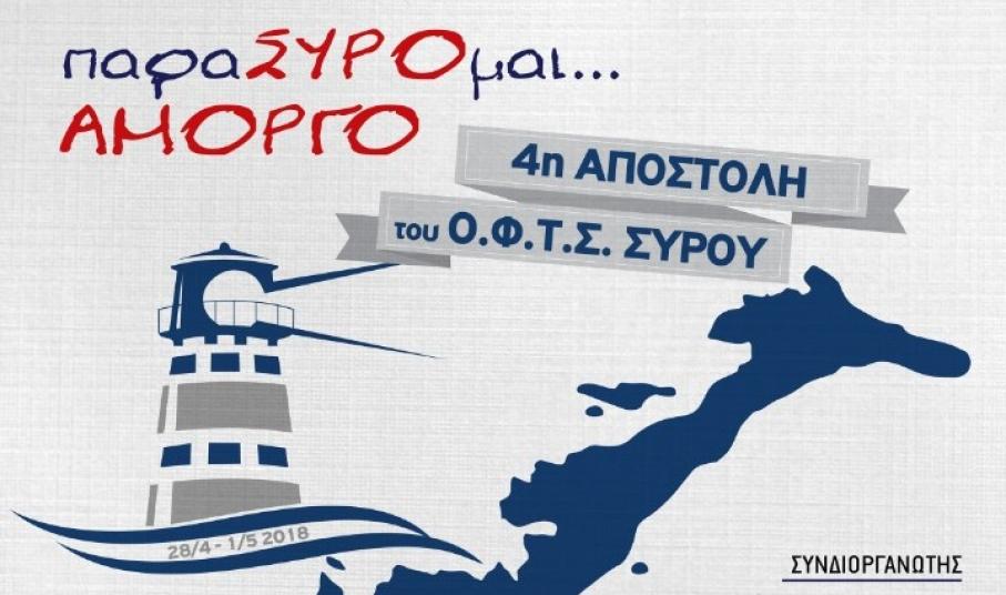Ο Όμιλος Φουσκωτών και Ταχυπλόων Σκαφών Σύρου θα πραγματοποιήσει την 4η αποστολή του με τίτλο "ΠαραΣΥΡΟμαι... Αμοργό" από 28 Απριλίου έως 1η Μαΐου στο νησί της Αμοργού. Η αποστολή έχει οικολογικό και εκπαιδευτικό χαρακτήρα και απευθύνεται κυρίως σε παιδιά. Στη διάρκεια της αποστολής θα πραγματοποιηθούν εκπαιδευτικές δράσεις, θεατρικές παραστάσεις, καθαρισμοί βυθού και παραλιών.