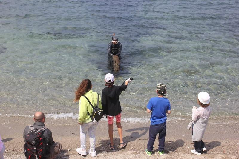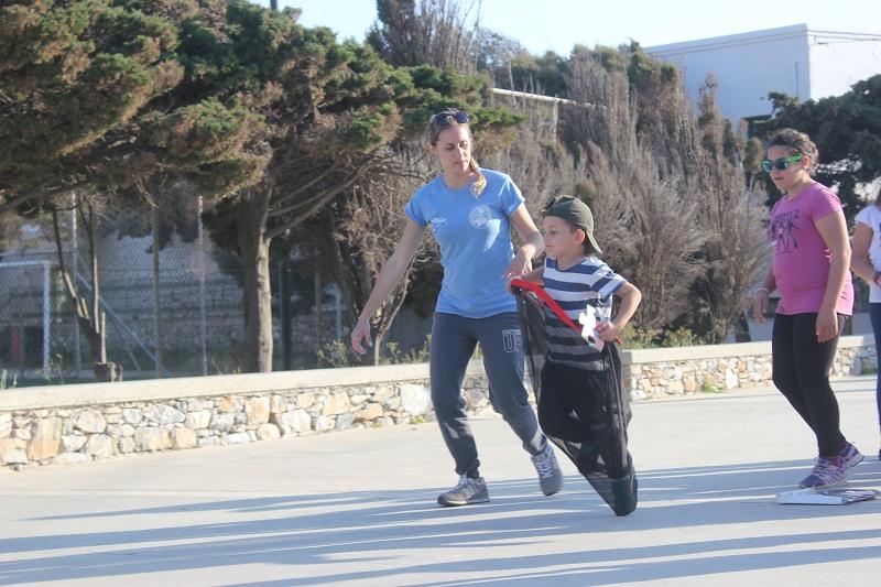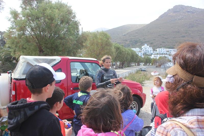 Αντίστοιχες δράσεις πραγματοποιήθηκαν το πρωί της Δευτέρας στο Δημοτικό Σχολείο Καταπόλων για τους μαθητές της πρωτοβάθμιας εκπαίδευσης του νησιού. Στη συνέχεια, τα παιδιά μαζί με τις εκπαιδευτικούς τους καθάρισαν την παραλία και παρακολούθησαν την κ. Τοπούζογλου η οποία βούτηξε στα παγωμένα, αλλά καταγάλανα νερά για να ανασύρει απορρίμματα από το βυθό. Μεταξύ αυτών, γυάλινα μπουκάλια, μία ρόδα και ένας μεγάλος σωλήνας, για την απομάκρυνση του οποίου δεσμεύτηκε ο Δήμος Αμοργού.