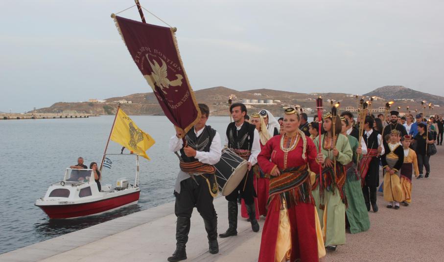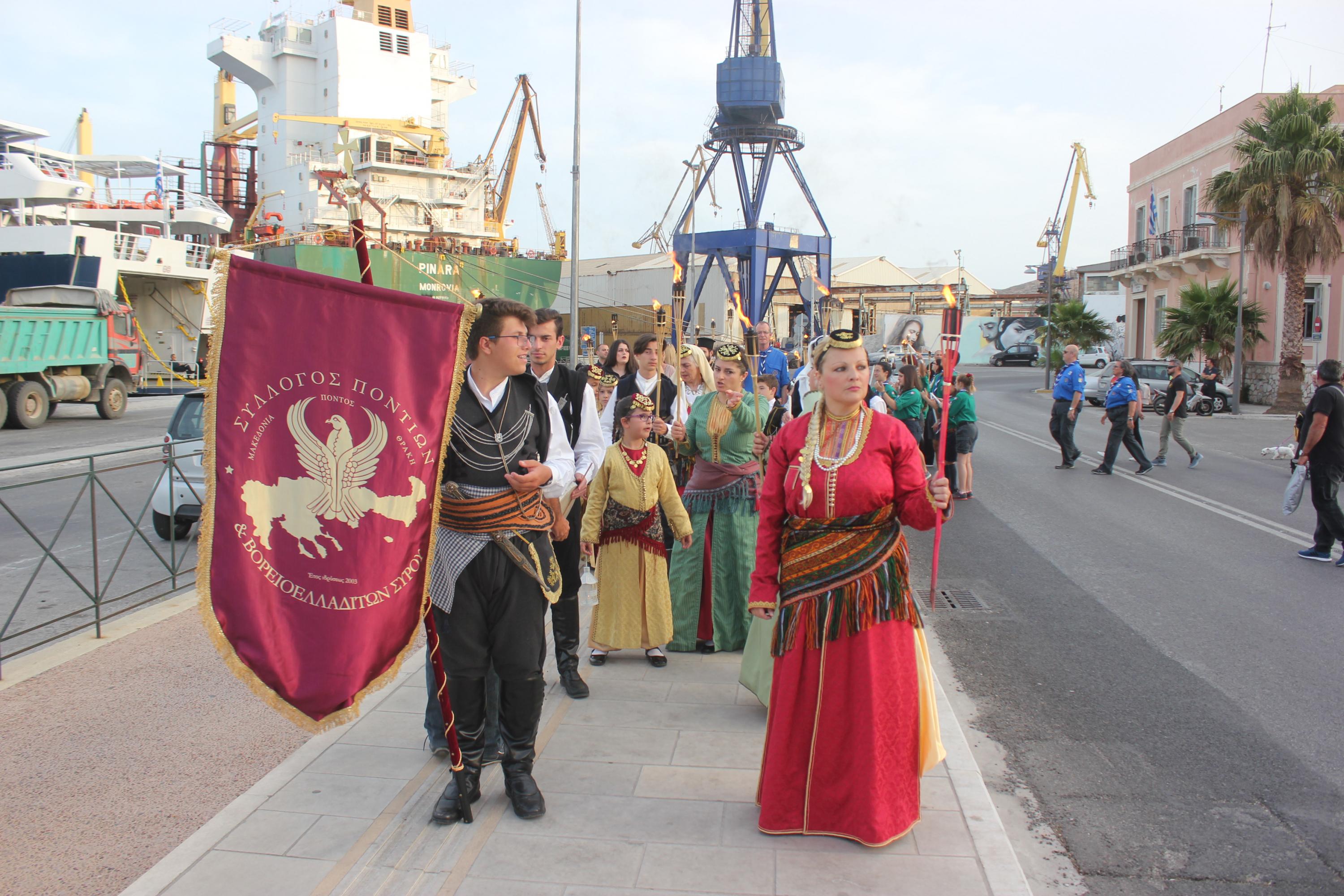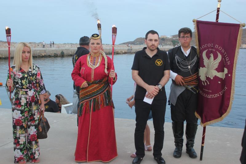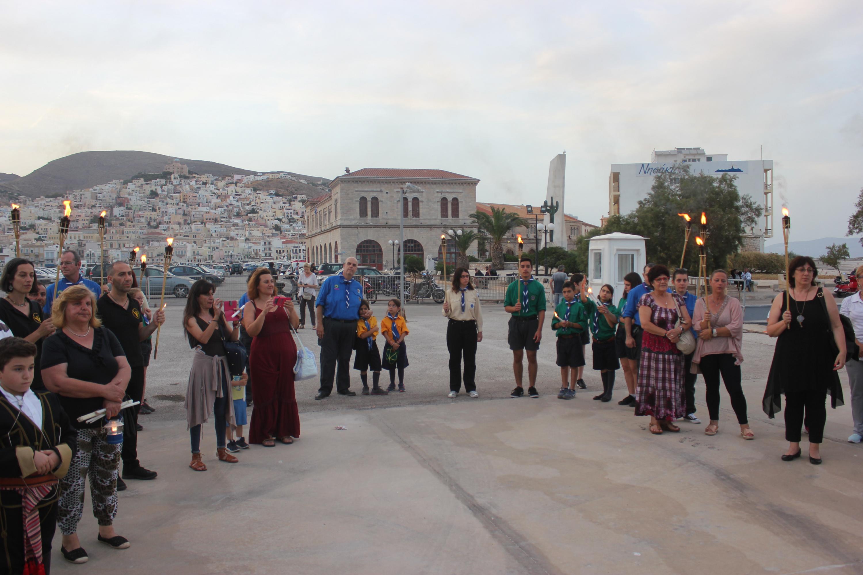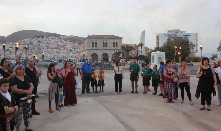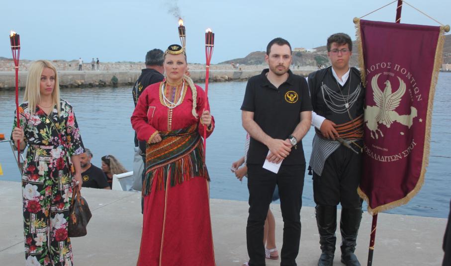 Το απόγευμα του Σαββάτου, με σημείο εκκίνησης τον χώρο αφετηρία των ΚΤΕΛ στο λιμάνι της Ερμούπολης, μέλη και φίλοι του Συλλόγου διήλθαν την παραλιακή οδό, φέροντας λαμπάδες για όλους εκείνους, που άφησαν σάρκα και οστά στη γη του Πόντου και κατέληξαν στην περιοχή «Νησάκι», όπου τελέστηκε επιμνημόσυνη δέηση από τον Αρχιμανδρίτη π. Νικόλαο Γαβαλλά και ρίψη στεφάνου στη θάλασσα για όλους εκείνους που οδηγήθηκαν σε υγρό τάφο.