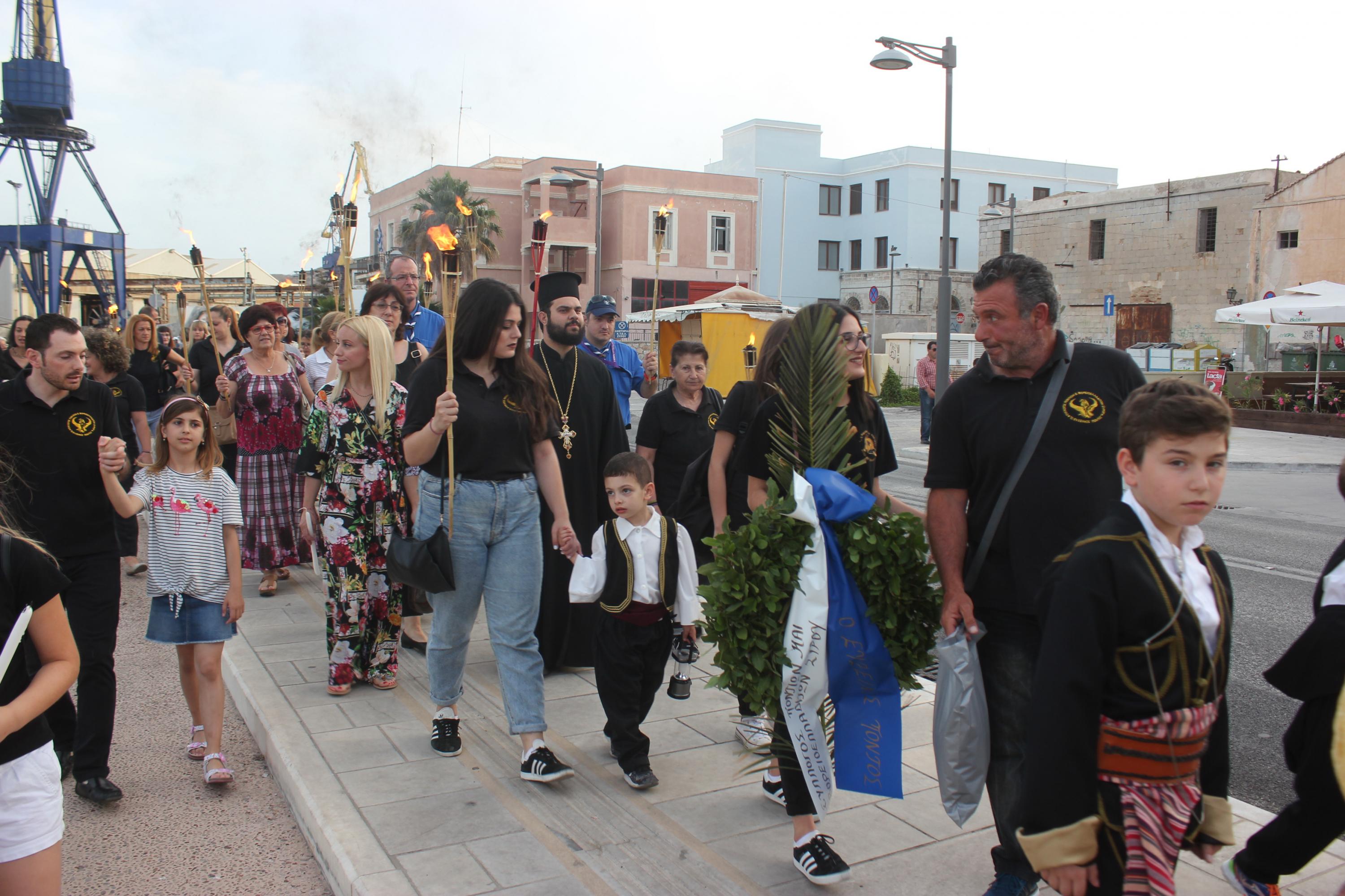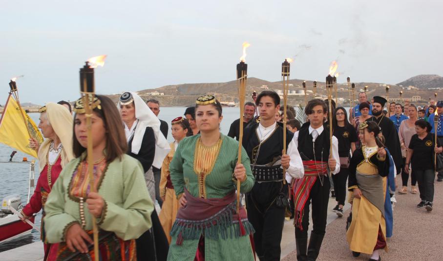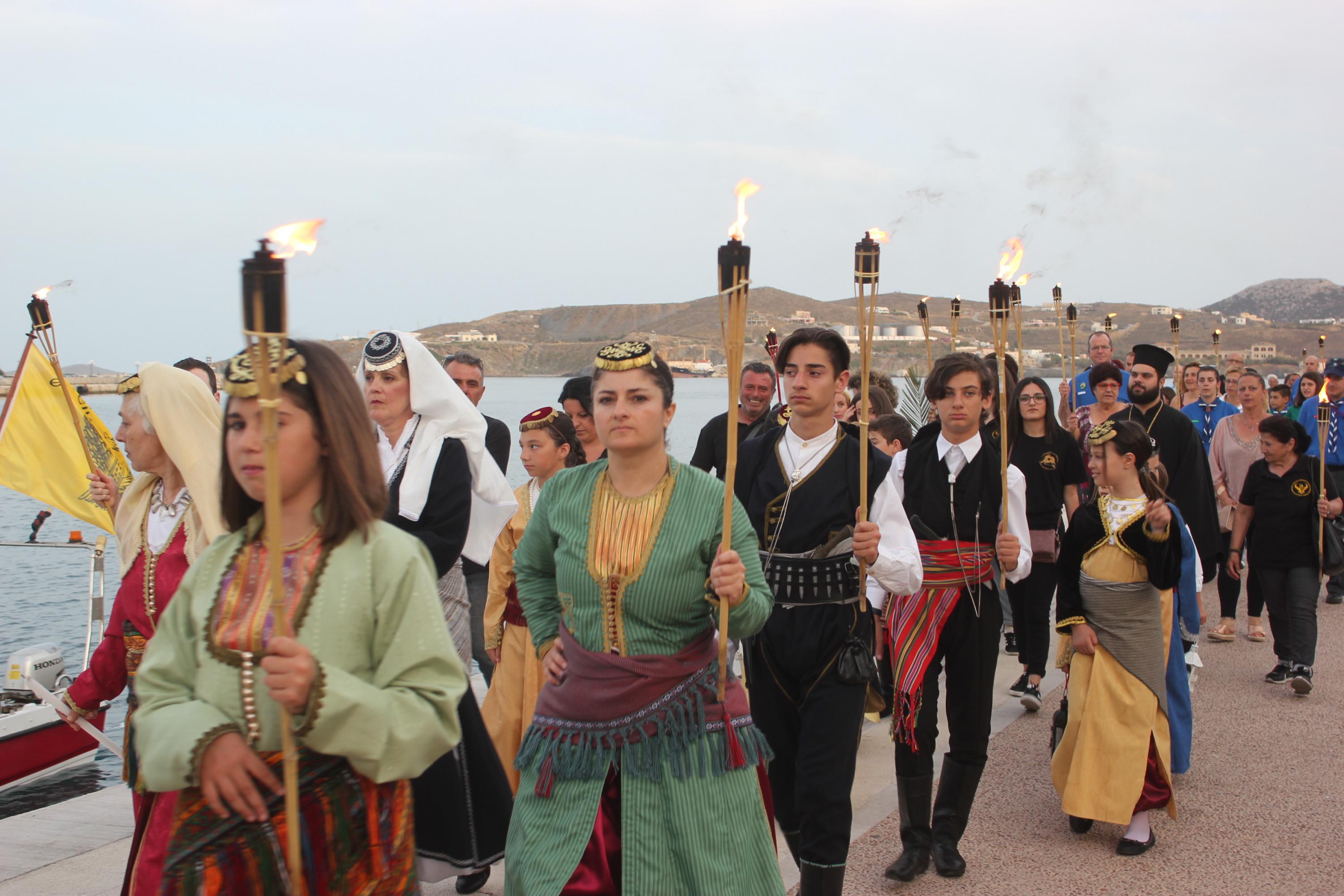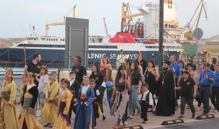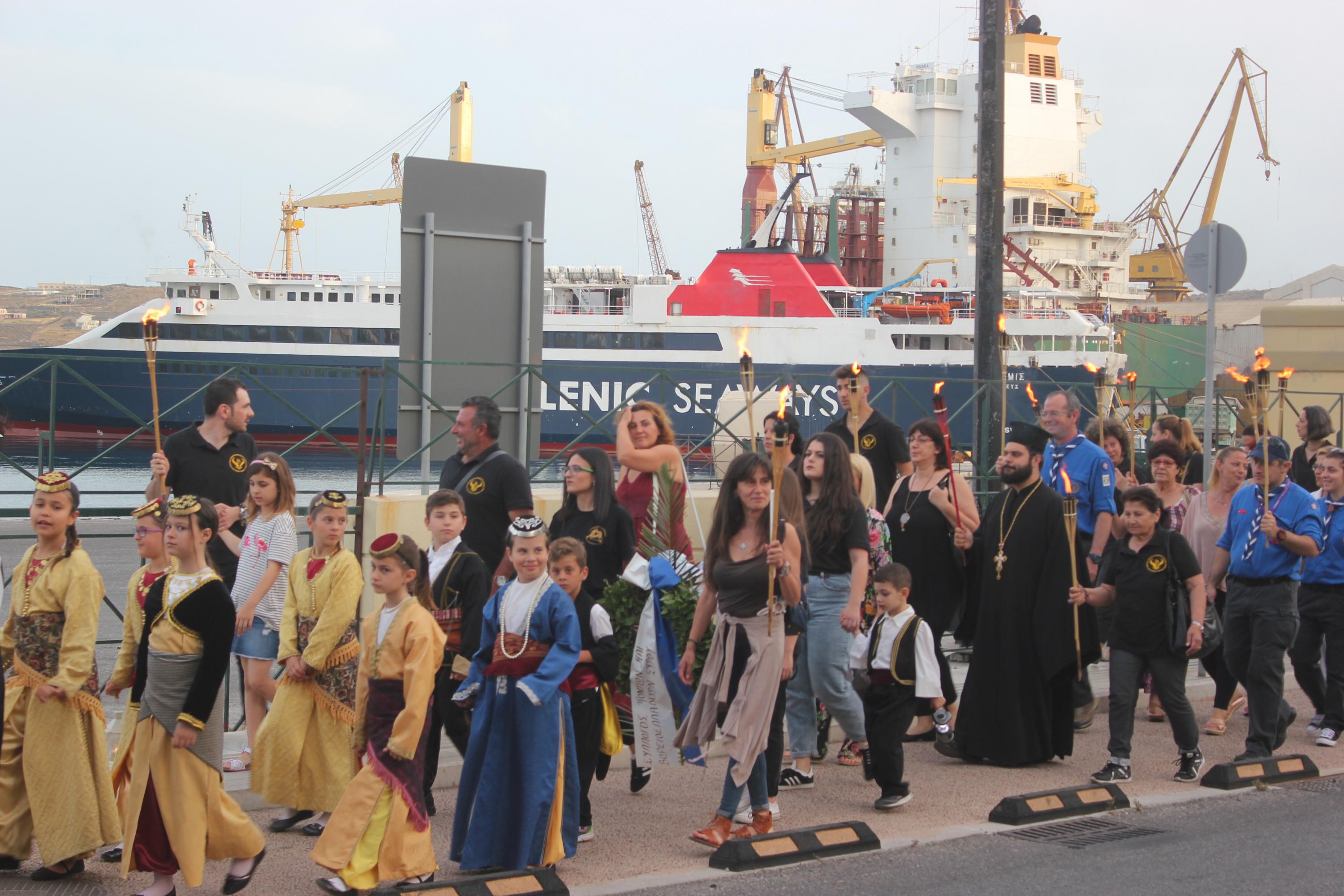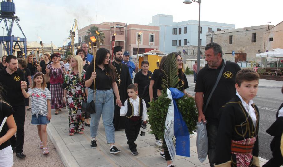 Το απόγευμα του Σαββάτου, με σημείο εκκίνησης τον χώρο αφετηρία των ΚΤΕΛ στο λιμάνι της Ερμούπολης, μέλη και φίλοι του Συλλόγου διήλθαν την παραλιακή οδό, φέροντας λαμπάδες για όλους εκείνους, που άφησαν σάρκα και οστά στη γη του Πόντου και κατέληξαν στην περιοχή «Νησάκι», όπου τελέστηκε επιμνημόσυνη δέηση από τον Αρχιμανδρίτη π. Νικόλαο Γαβαλλά και ρίψη στεφάνου στη θάλασσα για όλους εκείνους που οδηγήθηκαν σε υγρό τάφο.