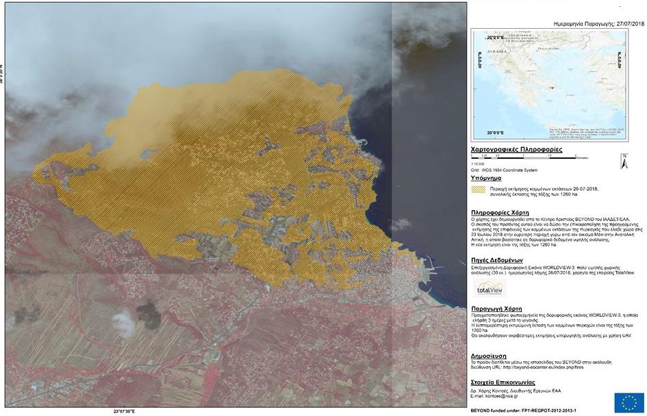 Το Κέντρο Διαχείρισης Φυσικών Καταστροφών BEYOND του Ινστιτούτου Αστρονομίας, Αστροφυσικής, Διαστημικών Εφαρμογών & Τηλεπισκόπησης (ΙΑΑΔΕΤ) του Εθνικού Αστεροσκοπείου Αθηνών (ΕΑΑ) δημοσίευσε επικαιροποιημένο χάρτη (26/7/2017), με λεπτομερή εκτίμηση των καμμένων εκτάσεων στην ευρύτερη περιοχή γύρω από τον οικισμό Μάτι (Ανατολική Αττική), με χρήση δορυφορικής τηλεπισκόπησης, με εκτιμώμενη έκταση της τάξης των 1260 ha.