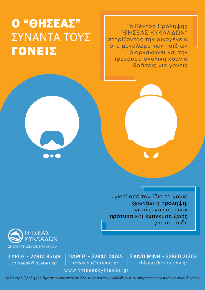 Το Κέντρο Πρόληψης των Εξαρτήσεων και Προαγωγής της Ψυχοκοινωνικής Υγείας «ΘΗΣΕΑΣ ΚΥΚΛΑΔΩΝ», στηρίζοντας την οικογένεια και το ρόλο του γονιού σε μια εποχή πολλών αλλαγών, διοργανώνει εκπαιδευτικές δράσεις για γονείς την τρέχουσα σχολική χρονιά 2018-2019: