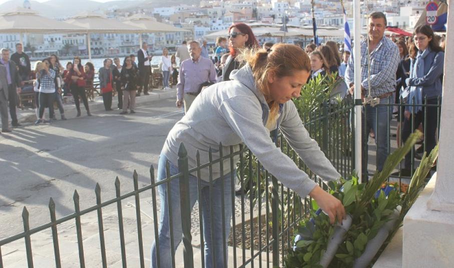 Σύμφωνα με το πρόγραμμα που σχεδιάστηκε και υλοποιήθηκε από την Περιφέρεια Νοτίου Αιγαίου, οι μαθητές του 6ου Δημοτικού Σχολείου Ερμούπολης και ο Σύλλογος Μικρασιατών Σύρου κατέθεσαν στεφάνι στο Μνημείο Μικρασιατικής Μνήμης στην περιοχή του προσφυγικού συνοικισμού στον Ξηρόκαμπο. Στη συνέχεια, στην προτομή του Ταγματάρχη Γεωργίου Δουράτσου, Διοικητή του Οχυρού “Ρούπελ” κατά τη διάρκεια της γερμανικής εισβολής το 1941, κατατέθηκε στεφάνι από μαθητές του 1ου Δημοτικού Σχολείου Ερμούπολης.