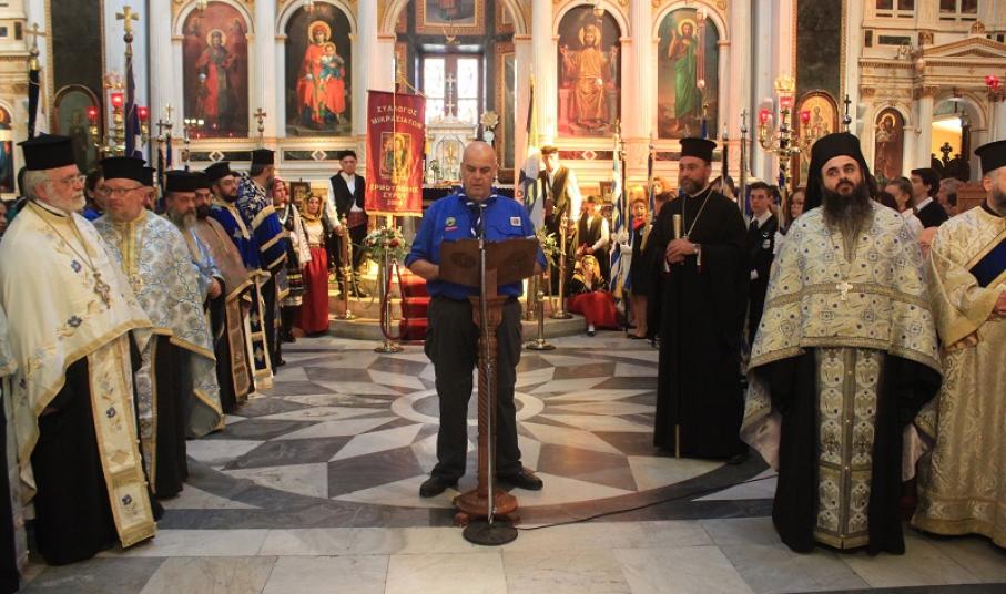 Μετά το πέρας της Δοξολογίας, εκφωνήθηκε ο Πανηγυρικός της Ημέρας από τον Περιφερειακό Έφορο Προσκόπων Κυκλάδων, Νεκτάριο Αλυφαντή, ο οποίος αναφέρθηκε στην καθοριστική και πολύτιμη προσφορά του Ελληνισμού στην ανθρωπότητα και στον παγκόσμιο πολιτισμού, κατά τη διάρκεια των αιώνων.