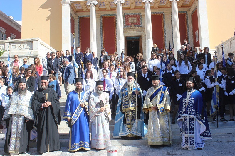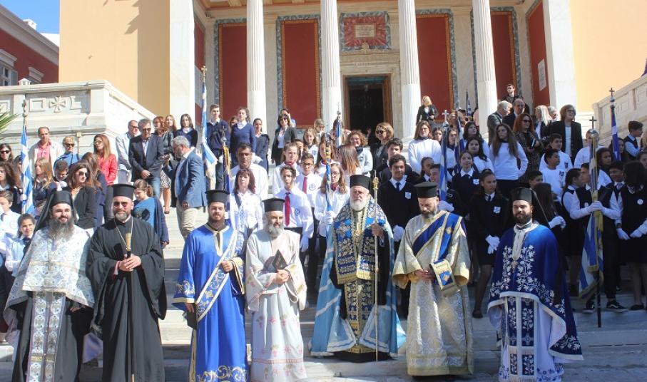 Της μαθητικής παρέλασης, προηγήθηκε επίσημη Δοξολογία στον Ιερό Ναό του Αγίου Νικολάου, χοροστατούντος του Σεβασμιωτάτου Μητροπολίτη Σύρου κ. Δωροθέου Β’.
