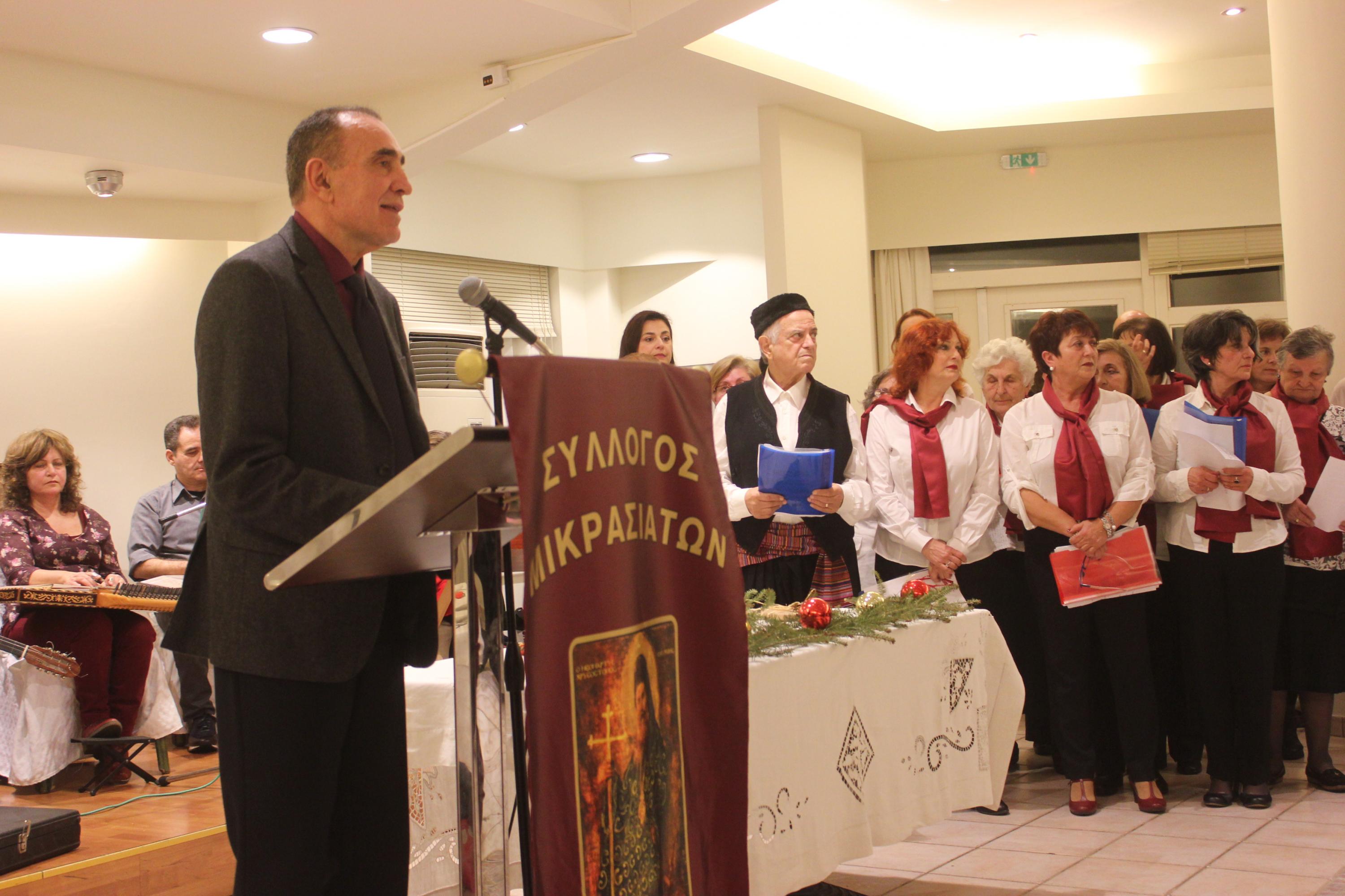 Ο πρόεδρος του Συλλόγου, Νικόλαος Λειβαδάρας, αφού καλωσόρισε τους παρευρισκόμενους, αναφέρθηκε στα έθιμα και τις συνήθειες της Μικρασιατικής οικογένειας κατά τη διάρκεια του δωδεκαημέρου των Χριστουγέννων. Στη συνέχεια, εξέφρασε την ικανοποίηση και τη συγκίνησή του για την αγάπη που επεφύλαξαν στη Στέγη Μικρασιατικής Μνήμης τόσο οι κάτοικοι όσο και οι επισκέπτες της Σύρου, μεταξύ αυτών και μαθητές αρκετών σχολείων από τη Βόρεια Ελλάδα και από άλλα μέρη της Ελλάδας.