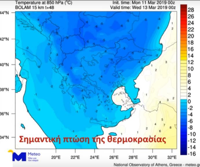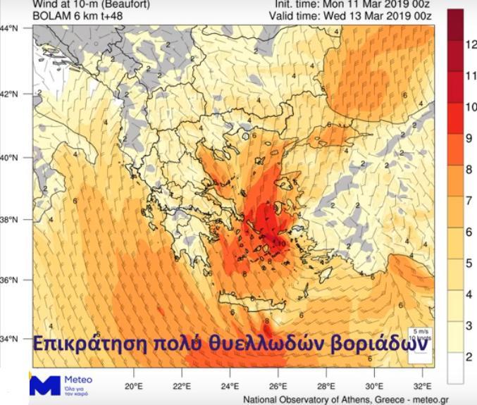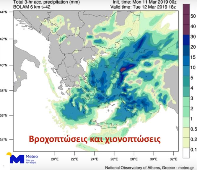 Την Τρίτη 12/03/2019 αναμένεται κακοκαιρία, με βροχές και καταιγίδες, οι οποίες θα είναι κατά τόπους ισχυρές στο Βορειοανατολικό Αιγαίο και τις βραδινές ώρες στη Θεσσαλία, τη Βόρεια Εύβοια και τα βόρεια τμήματα της Ανατολικής Στερεάς. Χιονοπτώσεις θα σημειωθούν στα ορεινά ηπειρωτικά και στη Δυτική Μακεδονία και από το μεσημέρι σταδιακά σε περιοχές της κεντρικής και βόρειας χώρας με χαμηλότερο υψόμετρο. Στη βορειοδυτική χώρα πάντως τα φαινόμενα από τις απογευματινές ώρες θα σταματήσουν. Οι άνεμοι θα πνέουν στο Βόρειο Αιγαίο και το Ιόνιο από βόρειες διευθύνσεις και στο υπόλοιπο Αιγαίο από νοτιοδυτικές διευθύνσεις θυελλώδεις 8 μποφόρ, όπου γρήγορα θα ενισχυθούν και βαθμιαία θα στραφούν παντού σε βόρειους πολύ θυελλώδεις 9 μποφόρ και τοπικά στο Κεντρικό Αιγαίο τα 10 μποφόρ, προκαλώντας προβλήματα στις ακτοπλοϊκές συγκοινωνίες και στα ανατολικά ηπειρωτικά τμήματα. Η θερμοκρασία σε σημαντική πτώση από τα βόρεια, δεν θα ξεπεράσει τους 10 βαθμούς στα βόρεια και τους 15-16 βαθμούς στις υπόλοιπες περιοχές της χώρας.