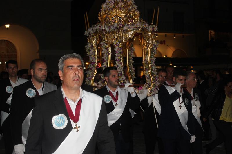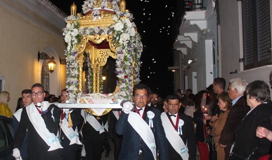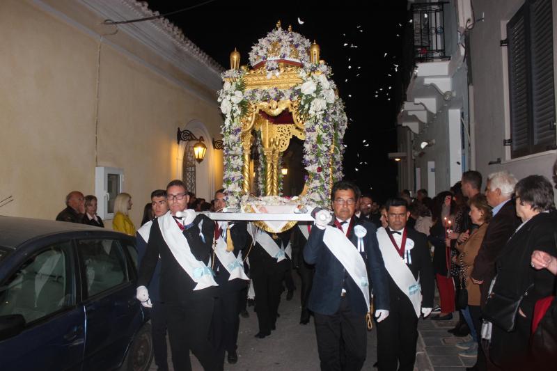 Προηγήθηκε η περιφορά του Επιταφίου του Ιερού Ναού Ευαγγελιστρίας Ερμουπόλεως, της Καθολικής Εκκλησίας, η οποία λάμπρυνε τους δρόμους του ιστορικού κέντρου. Πλήθος πιστών κατέκλυσαν το ναό και τους εξωτερικούς χώρους, για να παρακολουθήσουν την Ακολουθία των Αγίων Παθών του Κυρίου, προεξάρχοντος του Καθολικού Επισκόπου Σύρου Σεβ. π. Πέτρου Στεφάνου, μέσα σε κατανυκτική και συγκινητική ατμόσφαιρα υπό τους ύμνους που έψαλε η πολυφωνική χορωδία της ενορίας. Ανάμεσά τους ο Βουλευτής Κυκλάδων Αντώνης Συρίγος, αλλά και εκπρόσωποι της τοπικής αυτοδιοίκησης της Σύρου, οι οποίοι συμμετείχαν και στην περιφορά του Επιτάφιου, βασταζόμενου στους ώμους νέων. Η λιτάνευση του Επιταφίου τράβηξε τα βλέμματα εκατοντάδων επισκεπτών που είχαν συγκεντρωθεί στην πλατεία Μιαούλη απ’ όπου διέρχεται. Υπογραμμίζεται πως, ο Σεβασμιώτατος π. Πέτρος δεν συμμετείχε στην περιφορά προκειμένου να τελέσει την ακολουθία των Αγίων Παθών στον Καθεδρικό Ναό Αγίου Γεωργίου στην Άνω Σύρο.