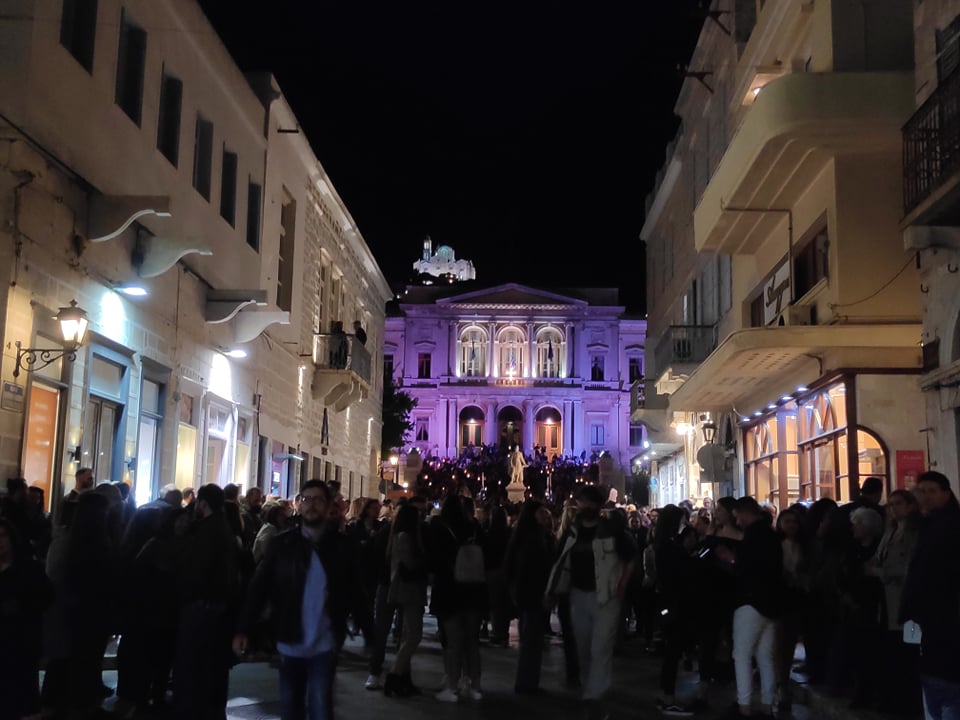 Πίστη, ελπίδα, γαλήνη, αγαλλίαση αλλά και θαυμασμός για την ομορφιά της πρωτεύουσας των Κυκλάδων, κατέκλυσαν λίγη ώρα αργότερα το ιστορικό κέντρο της Ερμούπολης και περιέβαλαν το επιβλητικό και εντυπωσιακά φωταγωγημένο Δημαρχιακό Μέγαρο της Σύρου, έμπροσθεν του οποίου πραγματοποιήθηκε η μεγαλοπρεπής συνάντηση των Επιταφίων των Ιερών Ναών Μεταμορφώσεως του Σωτήρος, Κοιμήσεως της Θεοτόκου και Αγίου Νικολάου.