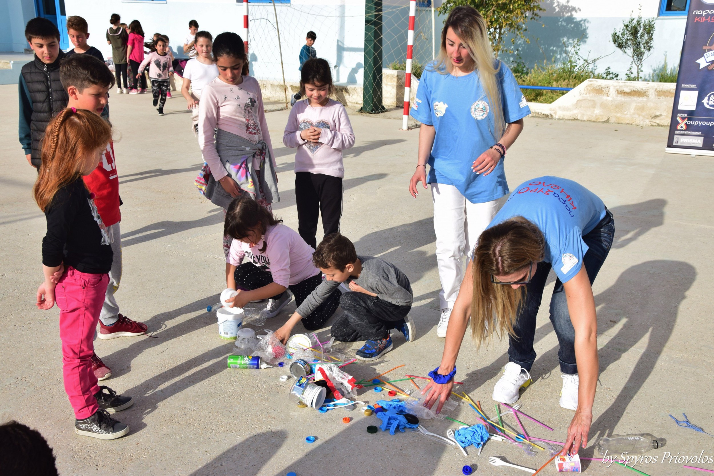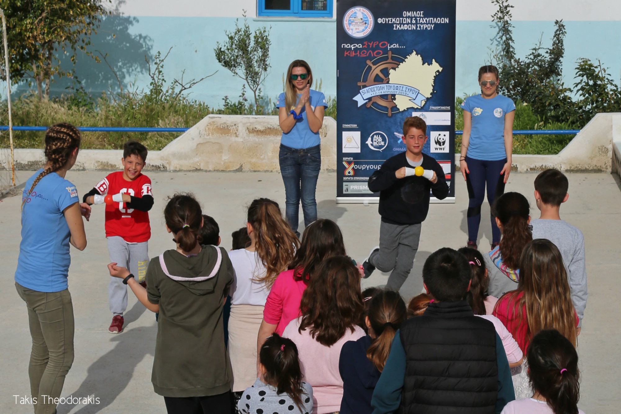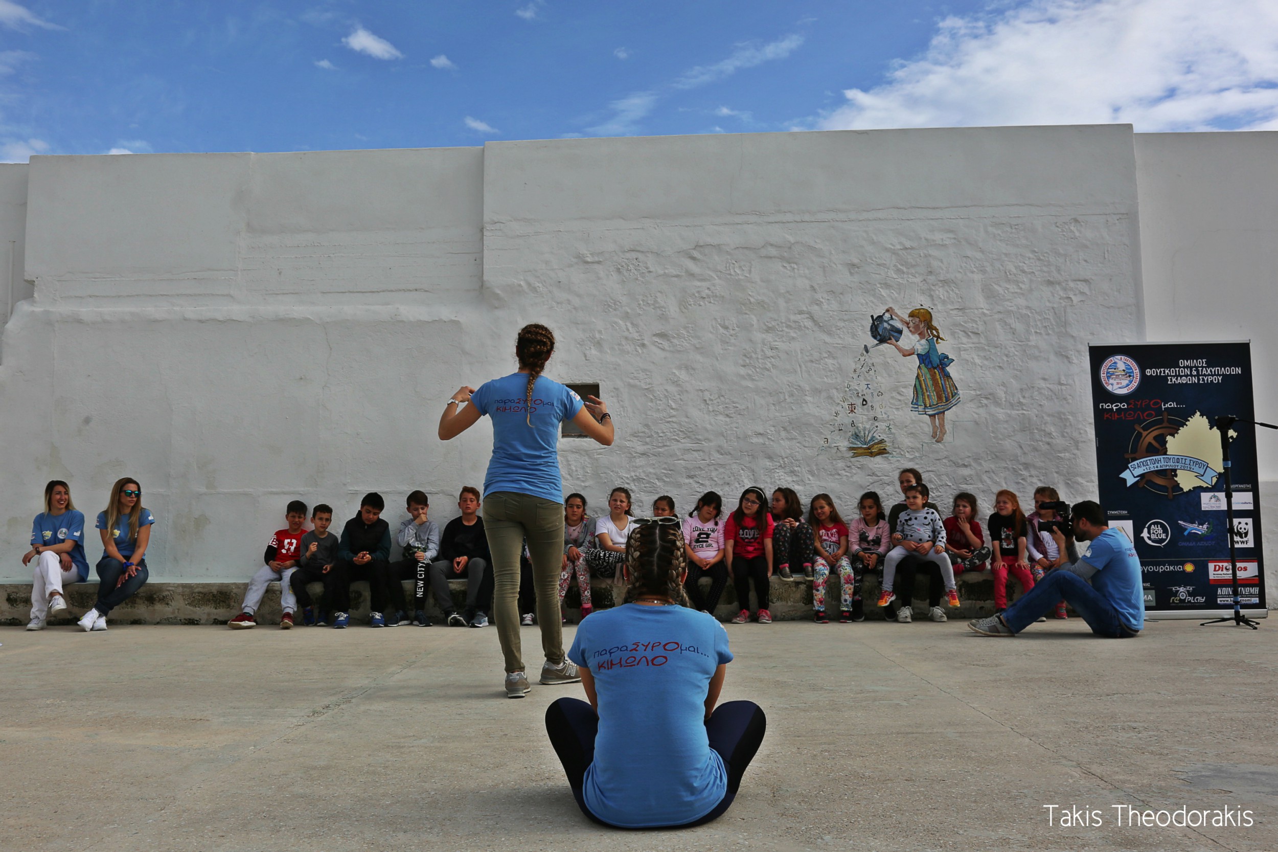 Αφού μοιραστήκαμε στα 6 αυτοκίνητα, άλλοι επέλεξαν την ξεκούραση στα καταλύματά τους που βρίσκονταν στο Χωριό Κιμώλου ενώ άλλοι παρέμειναν στην Ψάθη και μοιράστηκαν στα μαγαζιά της, για καφέ και φαγητό. Ο καιρός εν τω μεταξύ είχε γίνει καλοκαιρινός, με ένα ζεστό ήλιο μας υποδέχτηκε η Κίμωλος, αυξάνοντας την ευφορία των συμμετεχόντων της αποστολής. Η όμορφη χώρα της Κιμώλου, με τα στενά γραφικά δρομάκια και τα λευκά σπίτια που θα μας φιλοξενούσε για τις επόμενες δυο μέρες, κατέκτησε εξαρχής την καρδιά μας. Με μεγάλο ενθουσιασμό τα μέλη της παιδαγωγικής ομάδας συγκεντρώθηκαν, στο Δημοτικό Σχολείο της Κιμώλου, για την πρώτη δράση η οποία περιελάμβανε παιδαγωγικές και μουσικές δραστηριότητες, παιχνίδια με οικολογικό περιεχόμενο και face painting. Τα παιδιά του Χωριού συγκεντρώθηκαν από νωρίς και ανταποκρίθηκαν με ενθουσιασμό στις δραστηριότητες που είχαν ετοιμάσει οι παιδαγωγοί του Ομίλου. Η δράση διήρκεσε τρεις ώρες, από τις 17:00 μέχρι τις 20:00 και το ραντεβού με τα παιδιά ανανεώθηκε για την επόμενη μέρα. Ακολούθησε μια μικρή βόλτα στα στενά της Χώρας και το ραντεβού με όλους για φαγητό δόθηκε στις 10:00 το βράδυ, σε ταβέρνα του οικισμού. Στο ενδιάμεσο τα μέλη της ομάδας φορτοεκφόρτωσης κατέβηκαν στην Ψάθη για να παραλάβουν το φορτηγό της επιχείρησης Δίοδος, χορηγού της αποστολής με τα σκηνικά και τα ηχητικά συστήματά, από το πλοίο της τοπικής γραμμής.