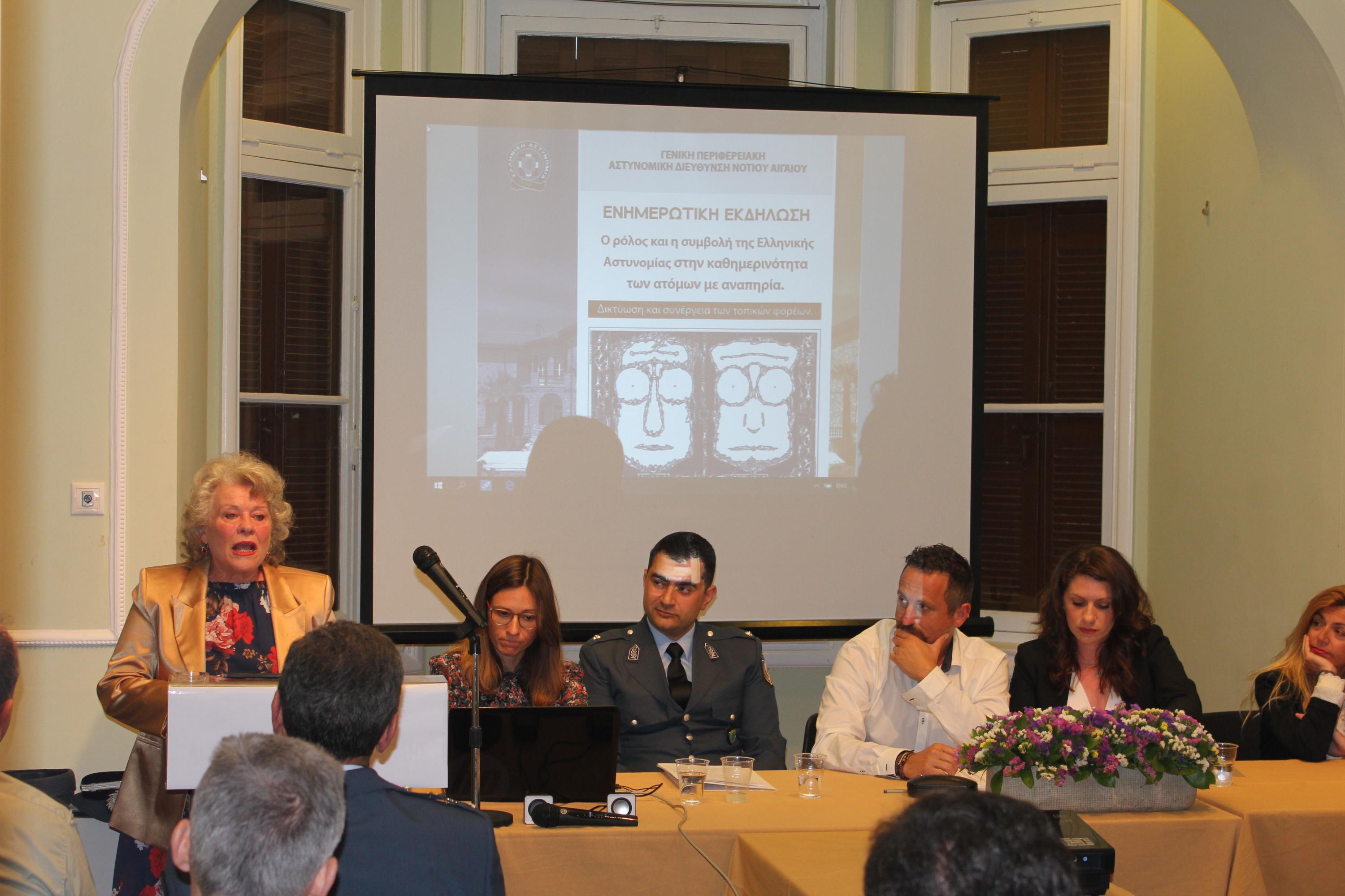 Όλα τα παραπάνω εξετάστηκαν στο πλαίσιο της ενημερωτικής ημερίδας με θέμα «Ο ρόλος και η συμβολή της Ελληνικής Αστυνομίας στη βελτίωση των συνθηκών της καθημερινότητας των ατόμων με αναπηρία. Δικτύωση και συνέργεια των τοπικών φορέων», η οποία διοργανώθηκε στη Σύρο από τη Γενική Περιφερειακή Αστυνομική Διεύθυνση Νοτίου Αιγαίου.