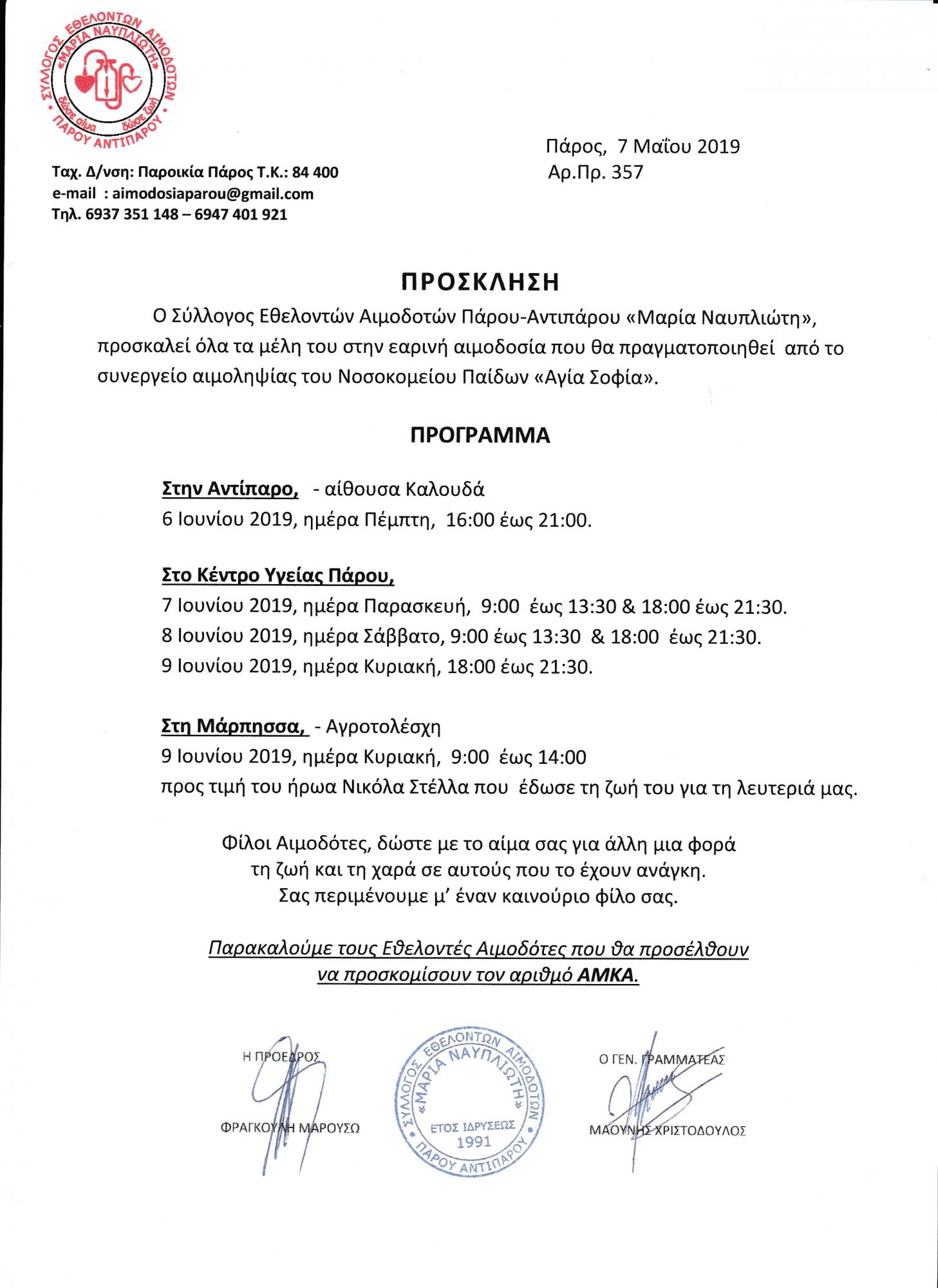 Ο Σύλλογος Εθελοντών Αιμοδοτών Πάρου - Αντιπάρου "Μαρία Ναυπλιώτη" προσκαλεί όλα τα μέλη του στην εαρινή αιμοδοσία που θα πραγματοποιηθεί από το συνεργείο αιμοληψίας του Νοσοκομείου Παίδων "Αγία Σοφία".
