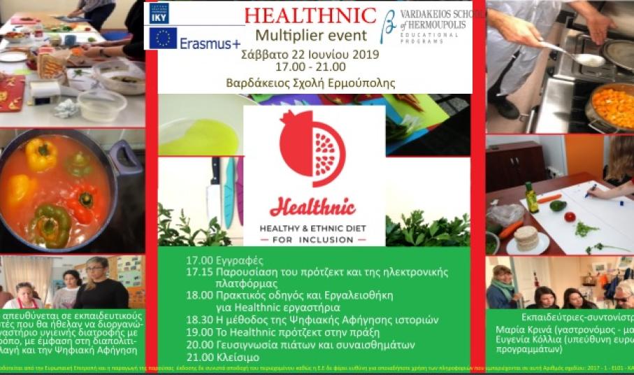 Τα αποτελέσματα του Erasmus+ έργου “Healthnic: Healthy and ethnic diet for inclusion” θα παρουσιαστούν στο πλαίσιο ενός εργαστηρίου, που προσφέρει στην κοινωνία της Σύρου να ενημερωθεί για την ανάπτυξη ενός νέου εκπαιδευτικού μέσου από τη Βαρδάκειο Σχολή Ερμούπολης, μέσω του σχεδιασμού και της διοργάνωσης των “Healthnic εργαστήριων”.